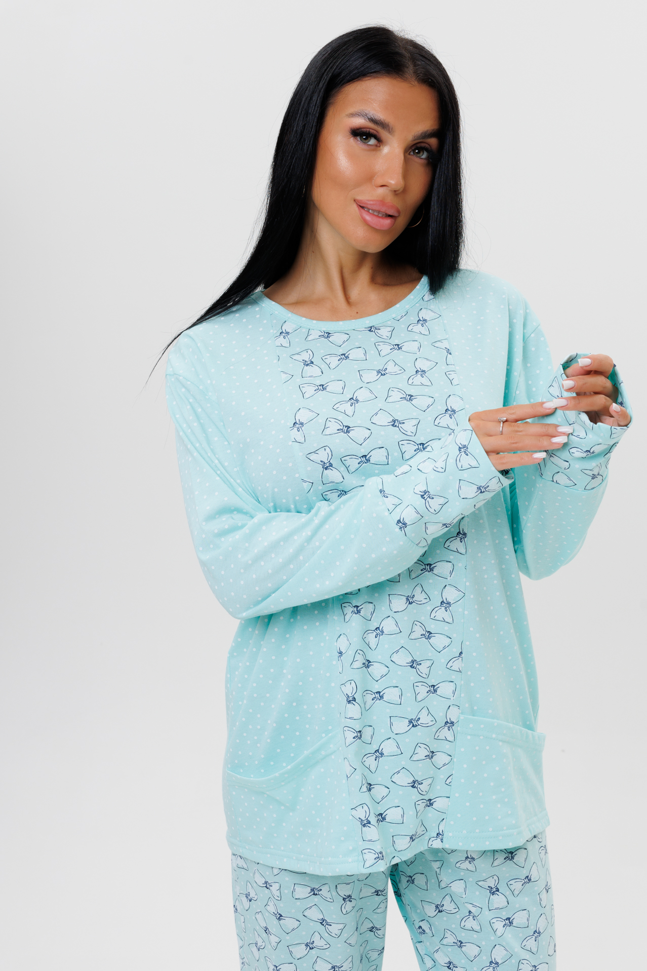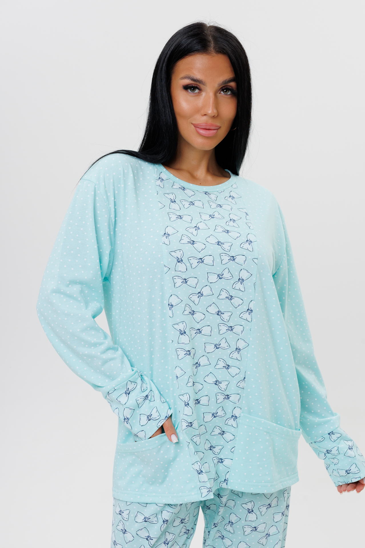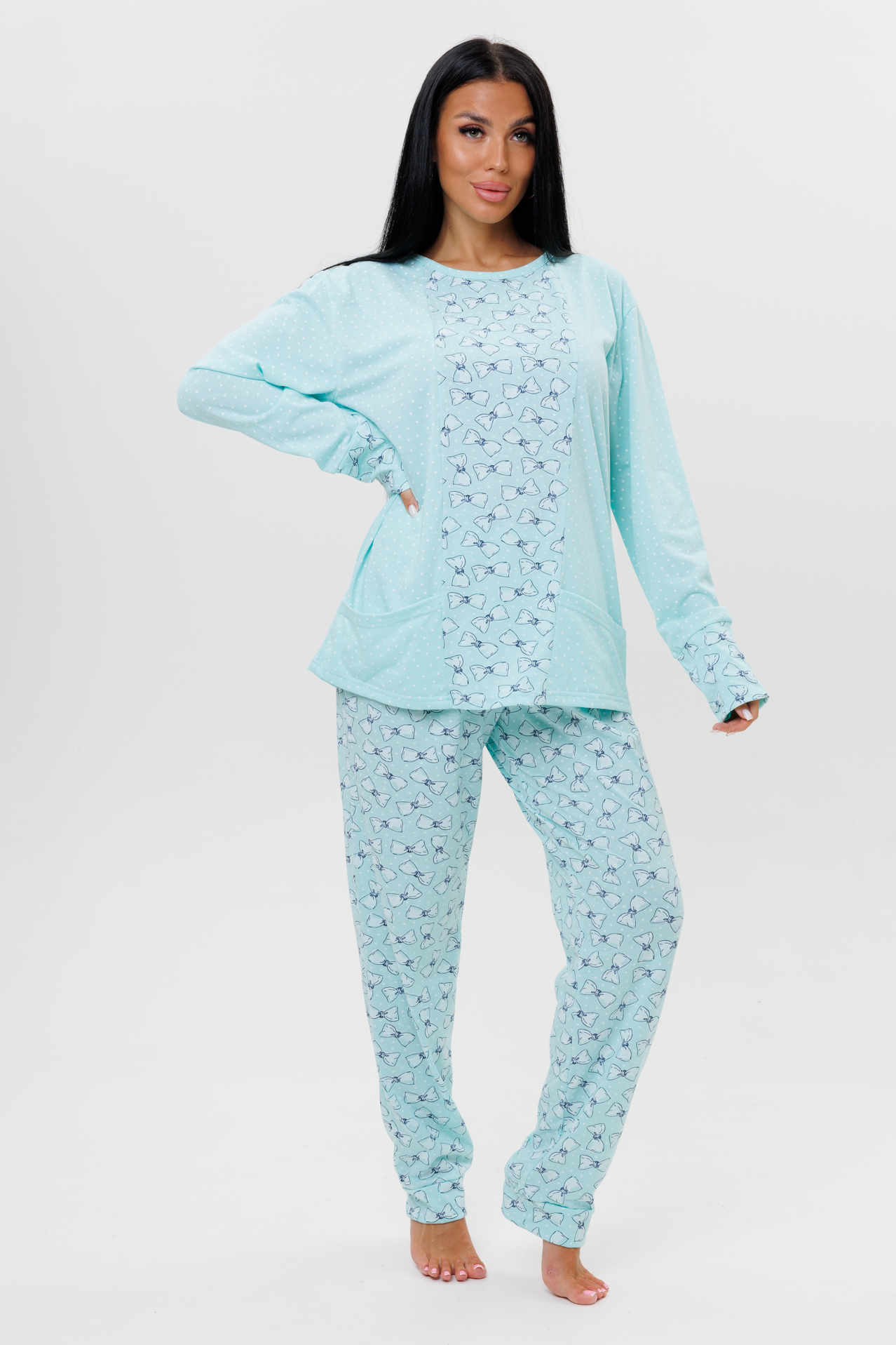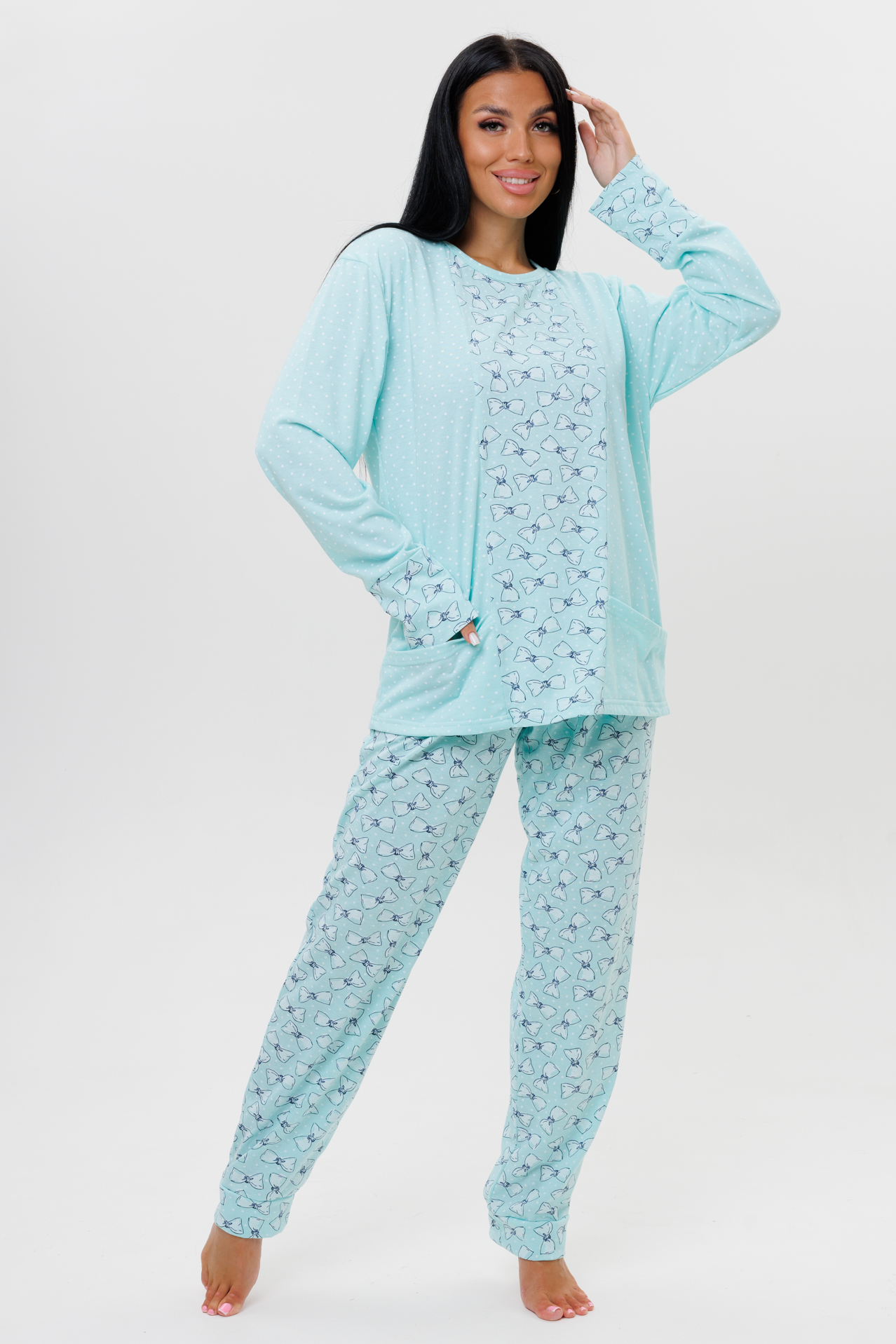 Пижама выполнена из трикотажного полотна кулирки со 100 % хлопком. Пижама состоит из кофты и брюк. Кофта с круглым вырезом, длинными рукавами с манжетами. Перед и манжеты рукава декорированы тканью компаньоном. Накладные карманы спереди входят в рельеф вставки. Брюки с манжетами на широкой резинке изготовлены из ткани компаньона.