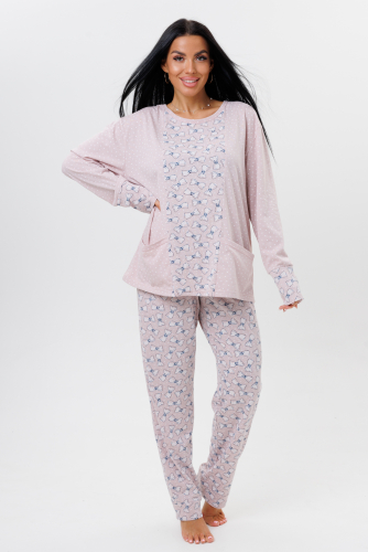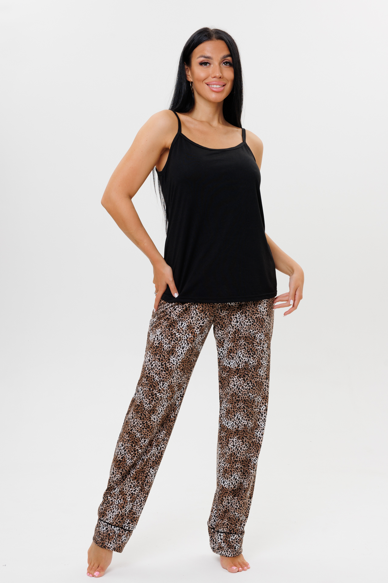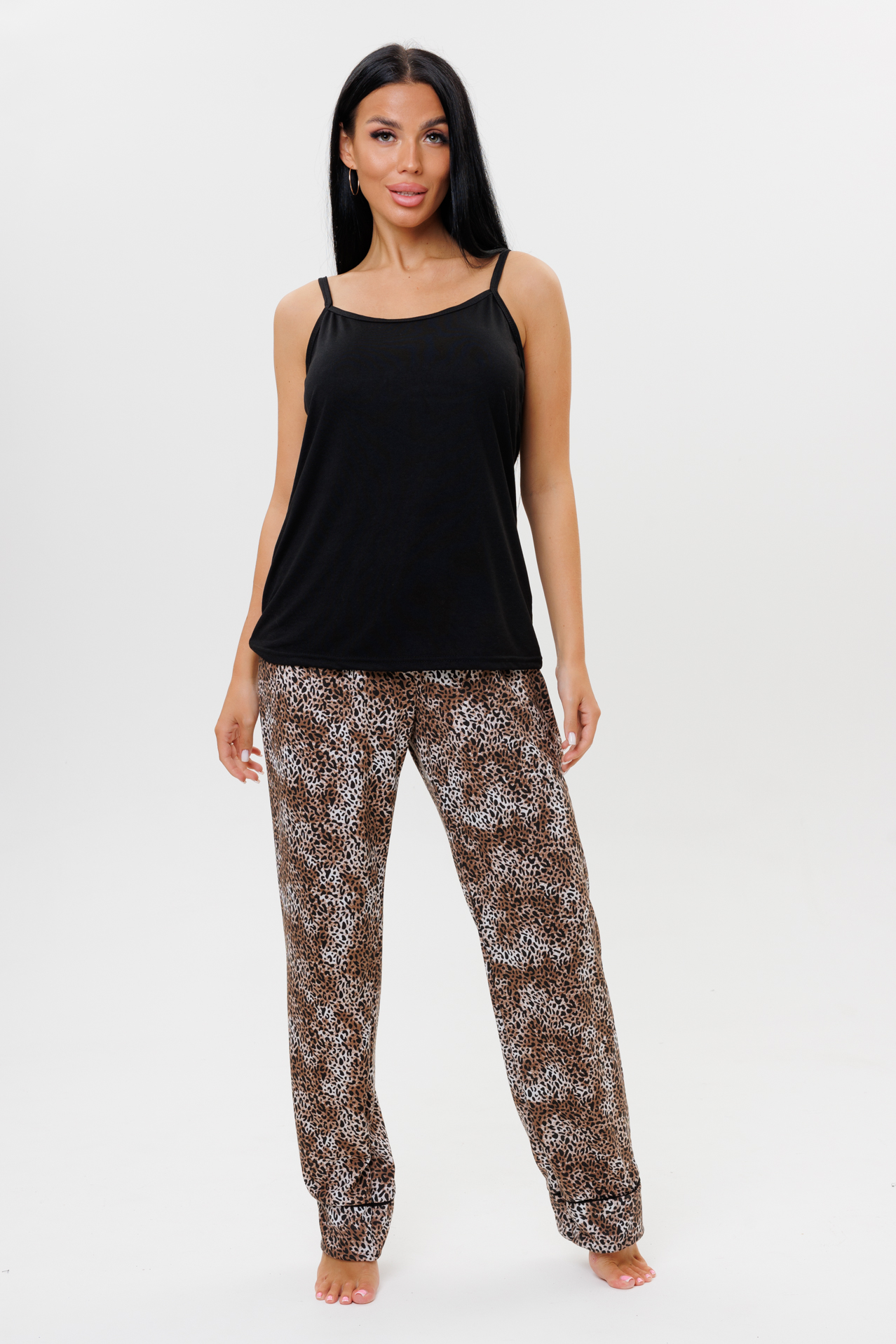 Пижамный комплект из вискозы состоит из однотонного топа на узких бретельках и брюк с анималистическим принтом на резинке. Изящество брюк подчеркивают оригинальные манжеты, окантованные однотонной тканью.