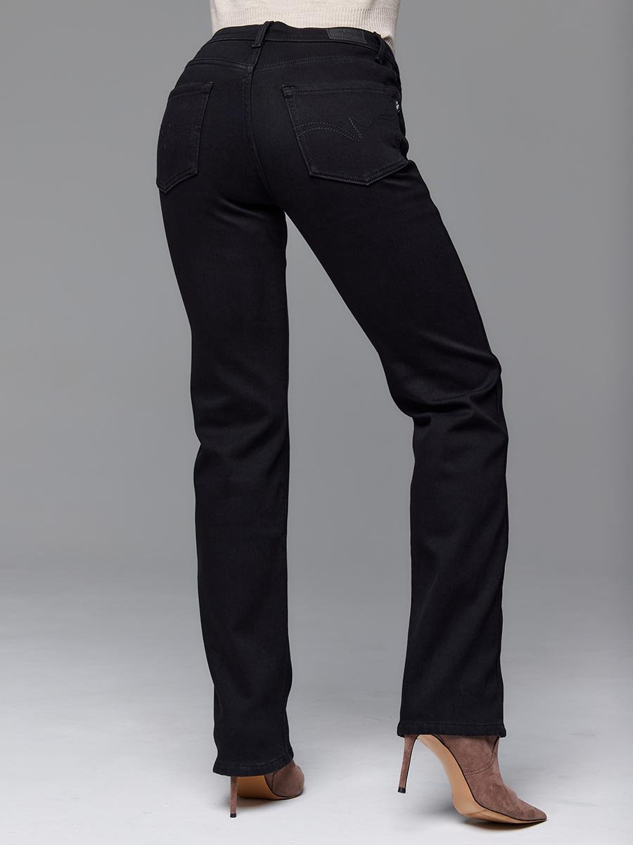 Женские классические утепленные джинсы с пятью карманами. Посадка Regular fit (полуоблегающие по бедру). Для улучшения посадки по талии сделан подкройной пояс из 2-х частей. Высокая талия. Застежка на молнии. Немного зауженные к низу. Выполнены из утепленной слабоэластичной ткани Black denim comfort stretch, к изнаночной ткани прикреплена дополнительная трикотажная ткань (флис) с мягким, шелковистым и приятным на ощупь ворсом.Темная стирка со слабовыраженными потертостями по швам.