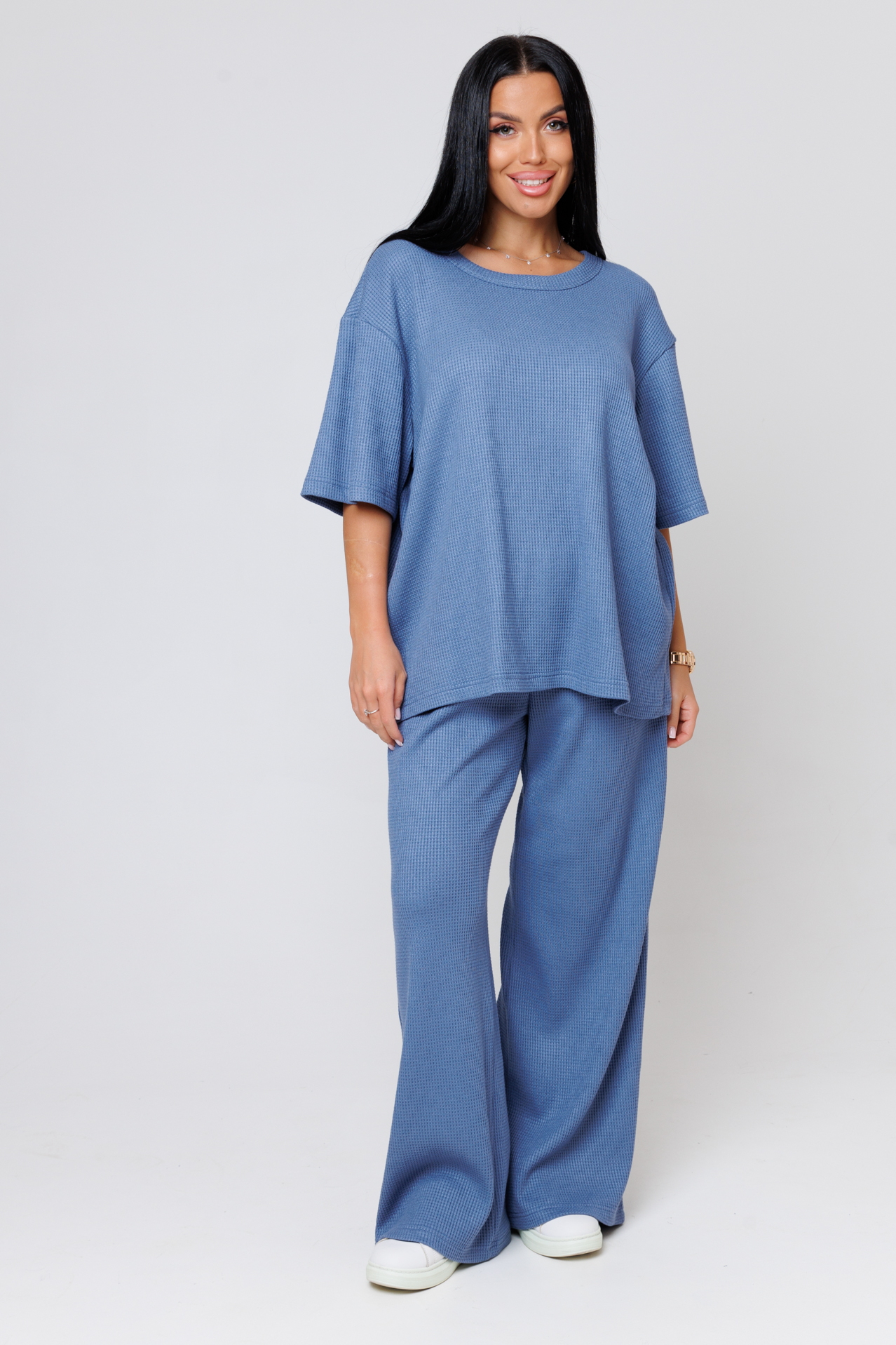 Домашние костюмы из трикотажной вафли в популярном стиле оверсайз. Свободные и удобные, не сковывают движения. Мягкая, приятная к телу ткань на 60% состоит из вискозы, отлично "дышит", сохраняет цвет и форму при стирке. Брюки широкие на резинке в стиле палаццо. Свободный спущенный рукав.