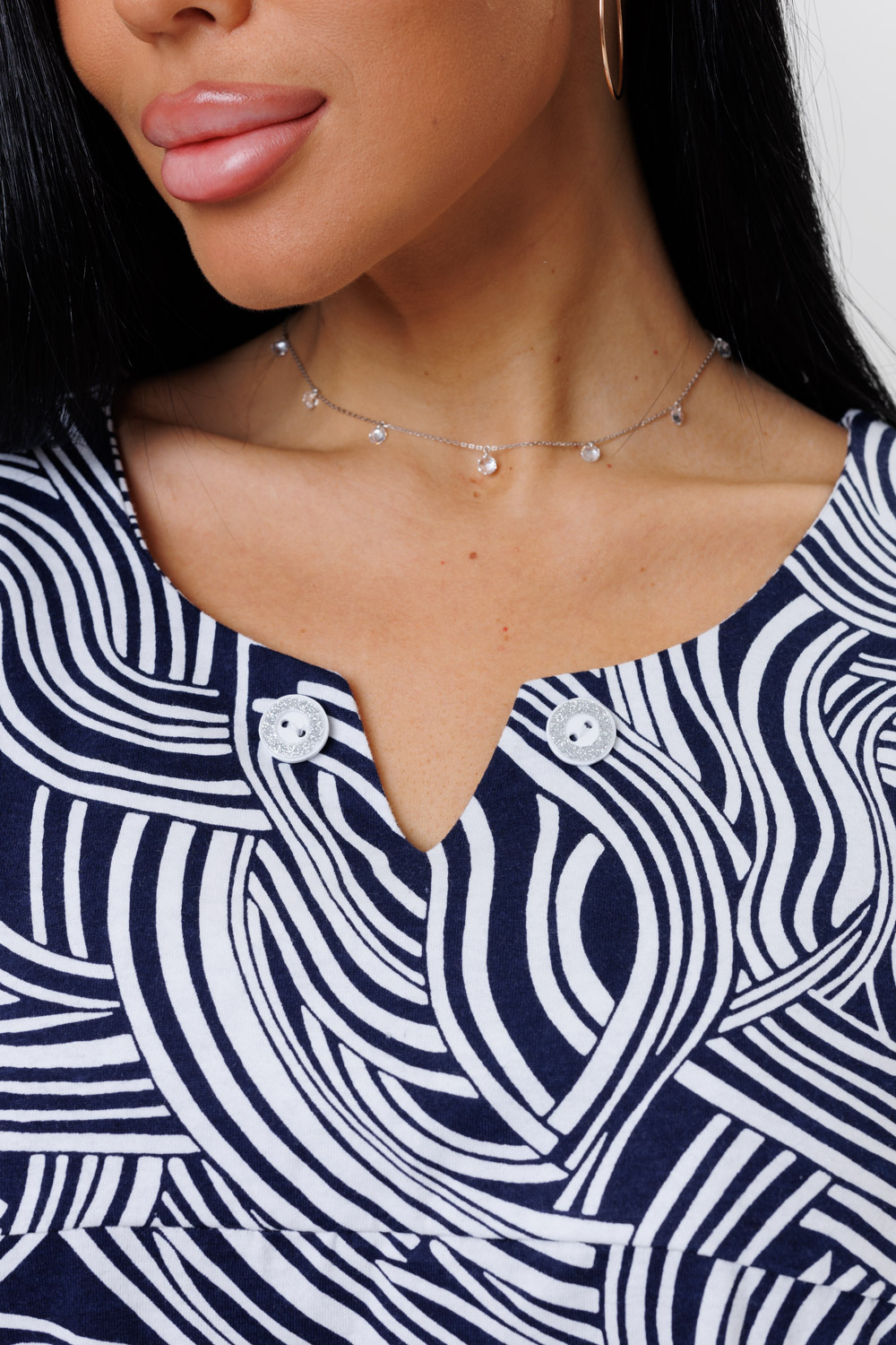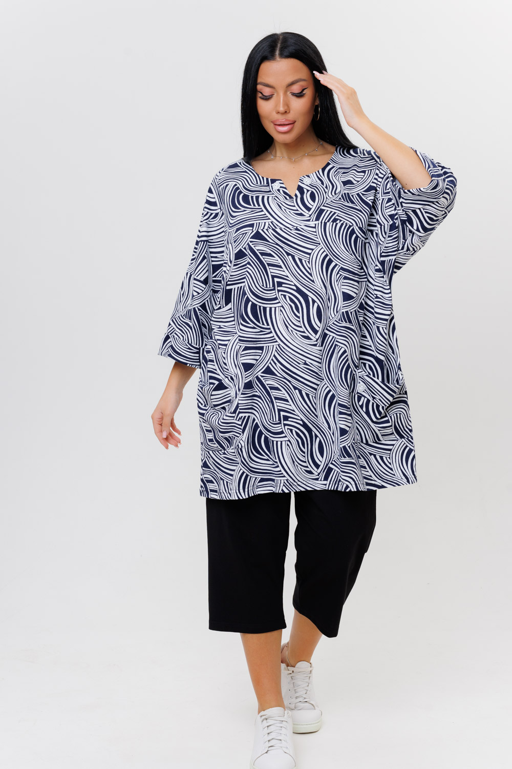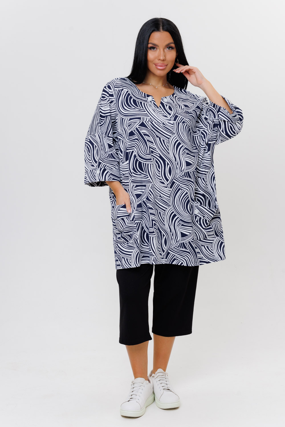Темно-синяя туника больших размеров с принтом «Волны». Яркая и стильная, с красивой фигурной горловиной. Изящная линия плеча. Глубокие вместительные карманы. Универсальная длина рукава, которая подойдет на любую погоду. Для женщин с фигурой plus size – это отличный вариант как для повседневного гардероба, так и по случаю праздника. Хорошо сочетается с брюками, бермудами, джинсами; с обувью на каблуке или плоской подошве.