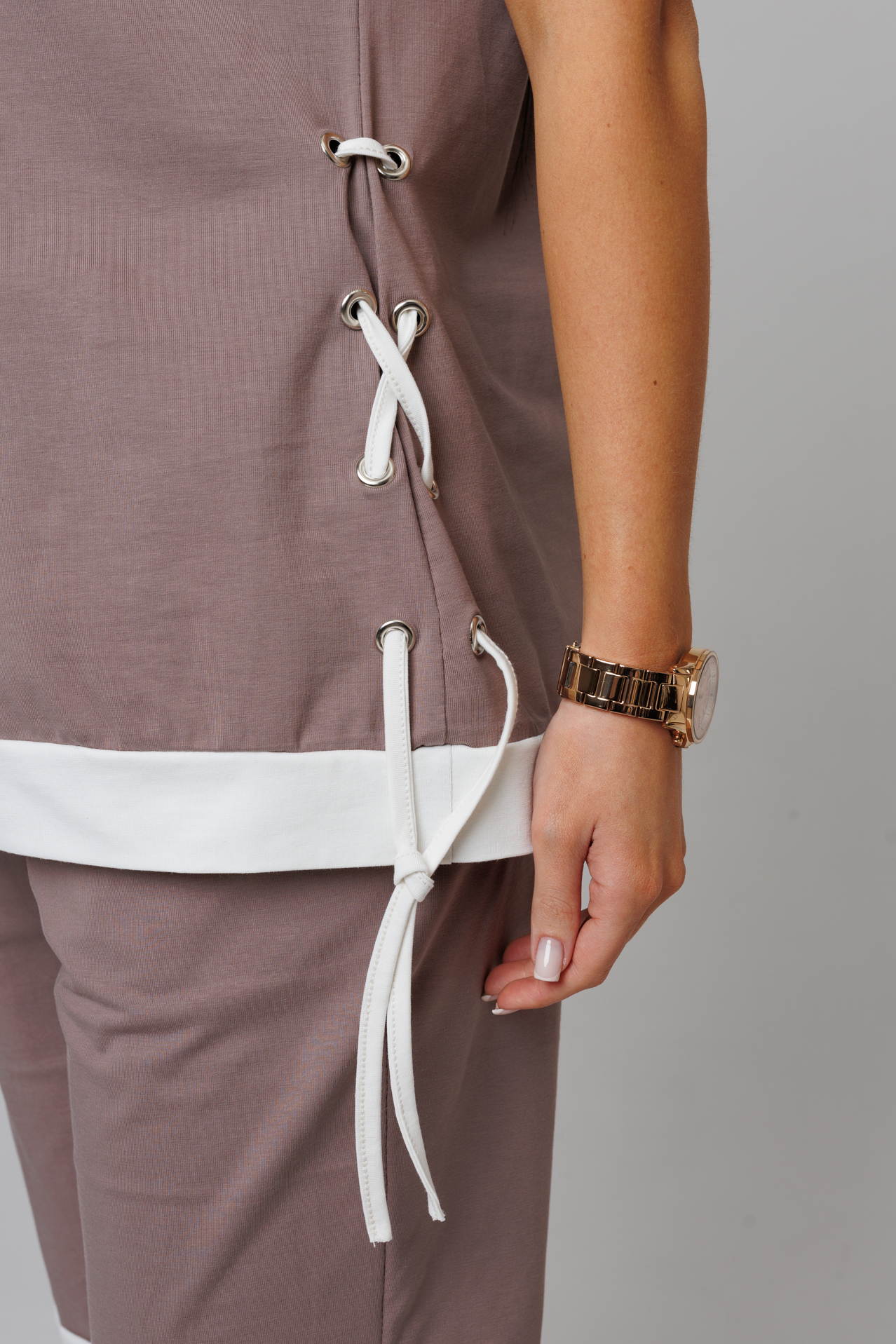 Костюм женский с бермудами идеальное решение для летнего гардероба. Костюм сшит из трикотажного полотна кулирки с лайкрой, которая придает ему дополнительную мягкость и удобство в носке. Комплект подходит как для повседневной носки, так и для отдыха на даче. Футболка имеет округлый вырез, короткие цельнокроеные рукава, на груди футболки принт в виде мерцающих страз. Бриджи выполнены из ткани компаньона, по линии талии мягкая эластичная резинка.