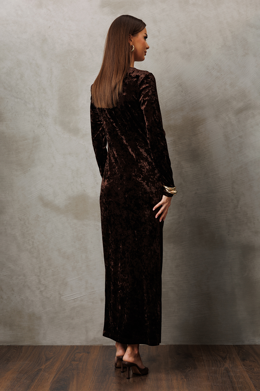 3183 100% ПЭ Платье 4000 42-50 170 коричневый Платье велюровое прилегающего силуэта с втачным длинным одношовным рукавом. Перед платья на запах, вырез горловины V-образный и складки от запаха. Платье без подкладки.
