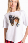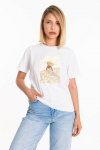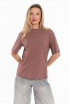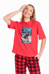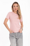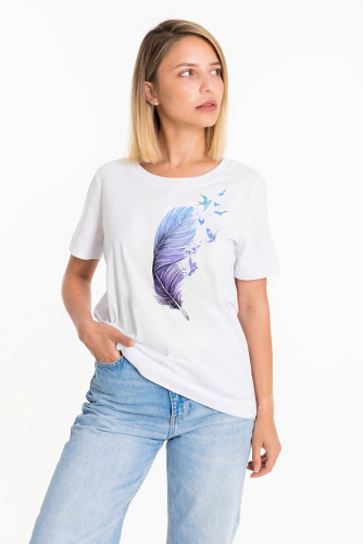 Футболка из однотонной кулирки с добавлением лайкры. С коротким рукавом и притачной планкой по горловине. Спереди нанесён принт.