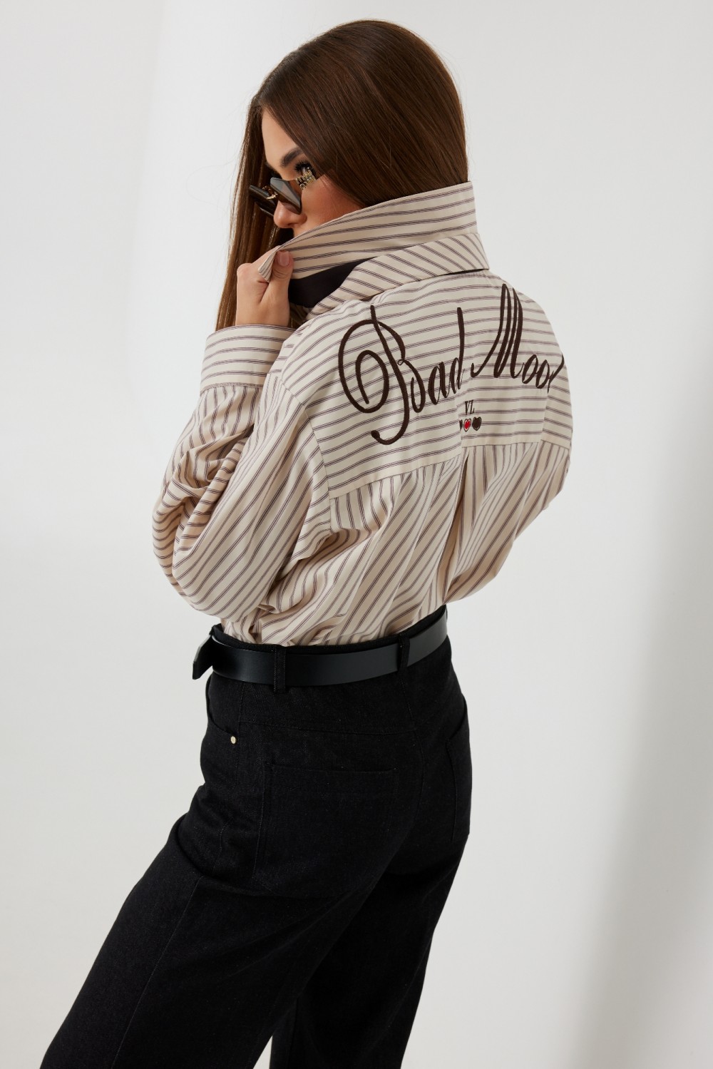 ткани в полоску. На спинке кокетка с оригинальной вышивкой. Застежка на петли и