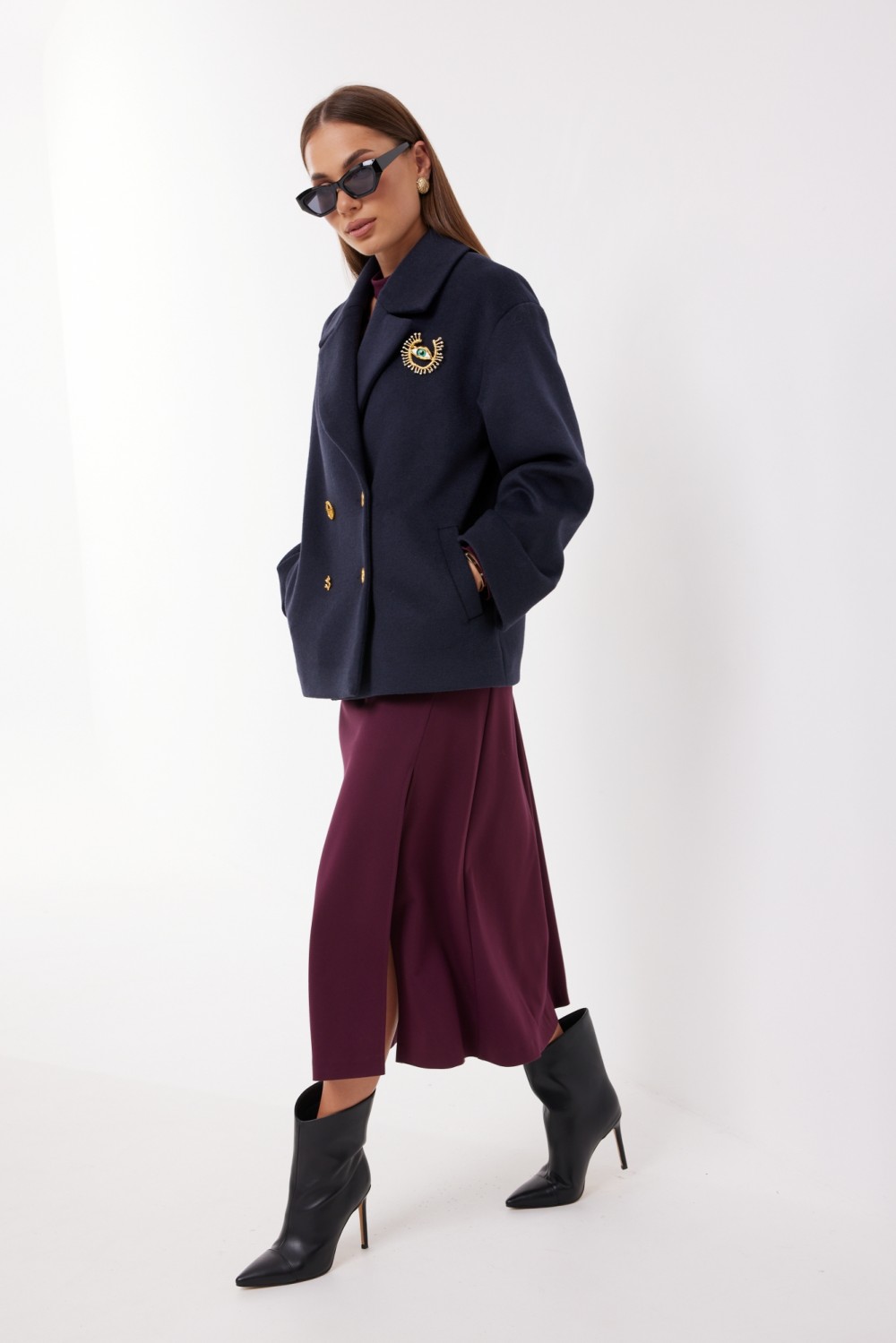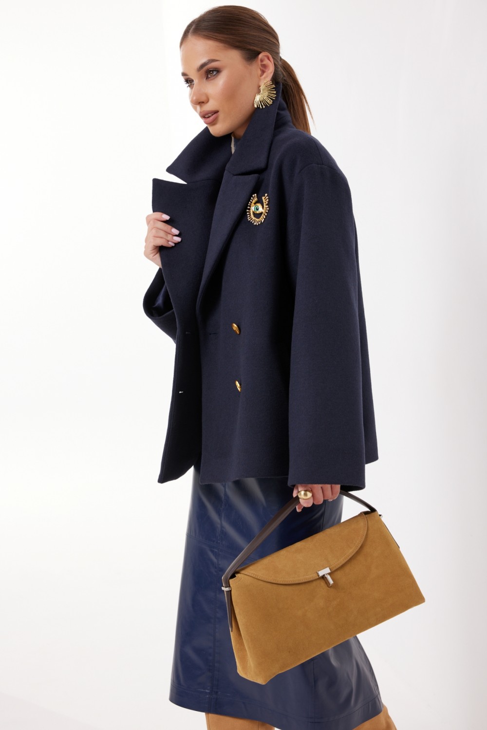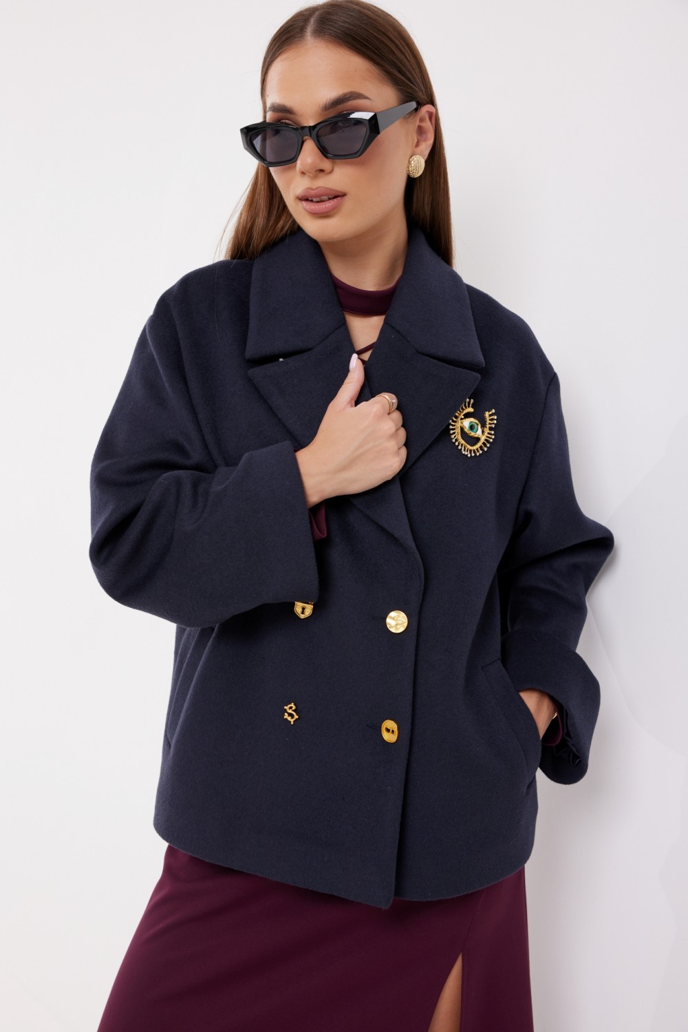 Английский воротник и двубортная застежка на оригинальные золотистые пуговицы