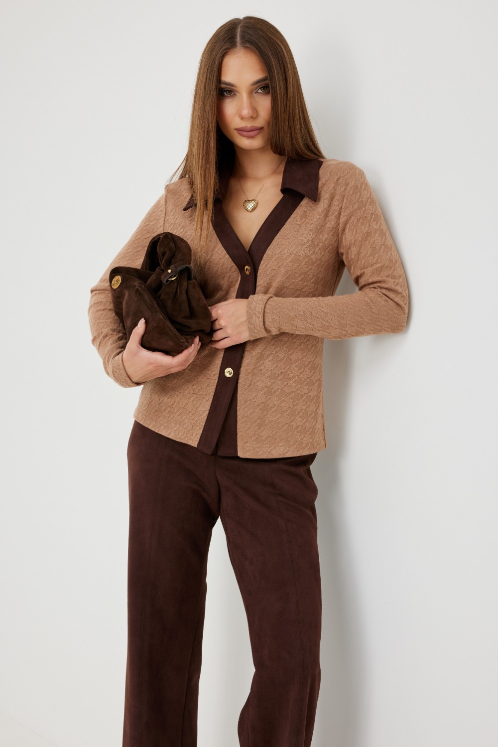 планка с воротником из отделочной ткани. Длинные рукава и удобная застежка на