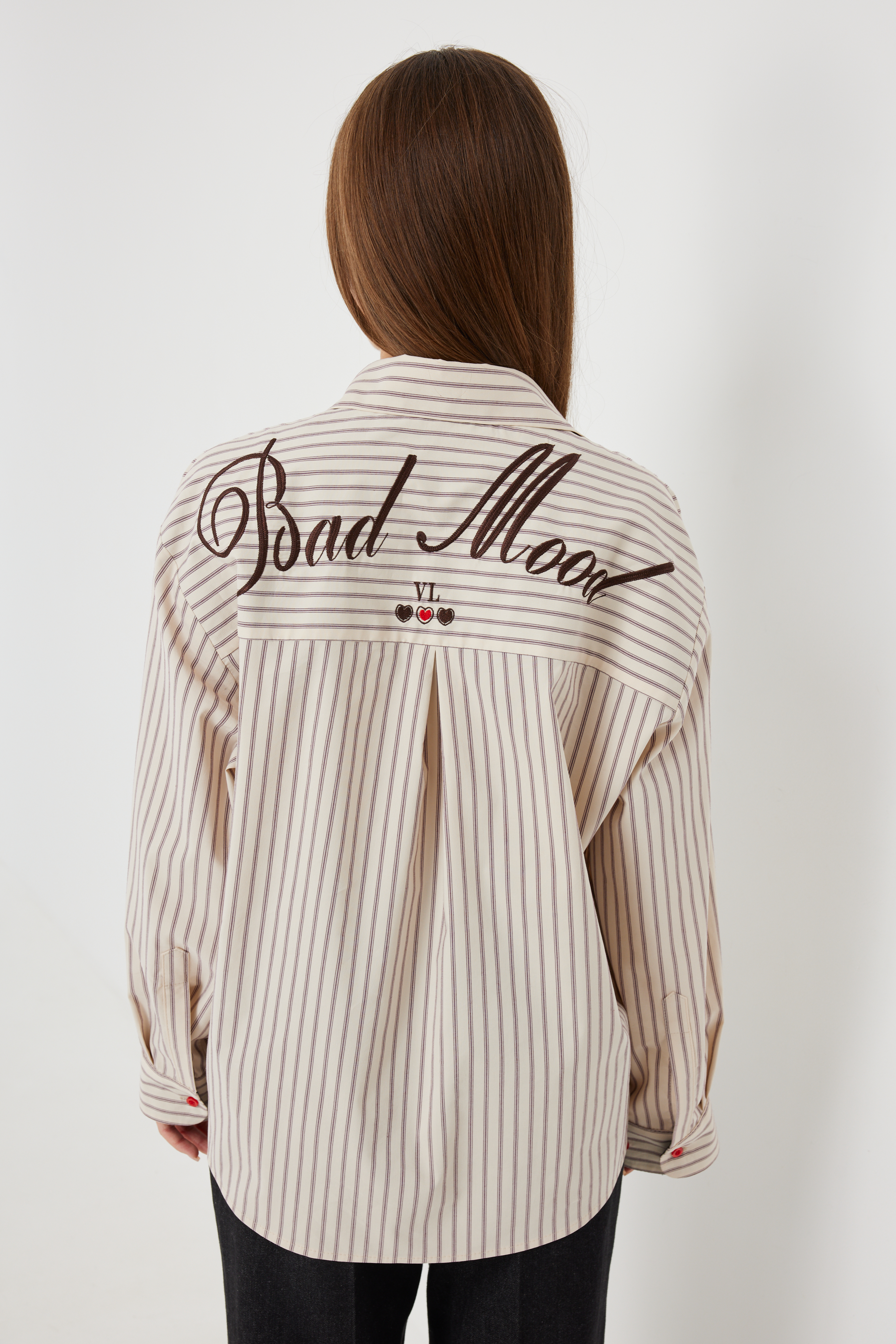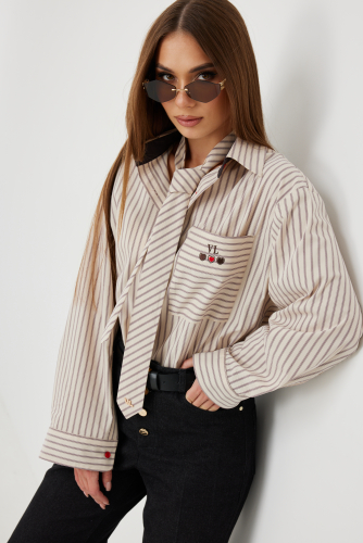 ткани в полоску. На спинке кокетка с оригинальной вышивкой. Застежка на петли и