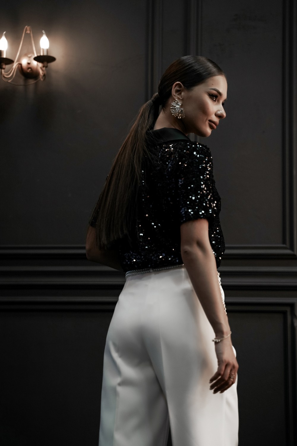 " 164-170 см. - 24 см. "Блузка женская из трикотажного полотна в пайетки, прямого силуэта,