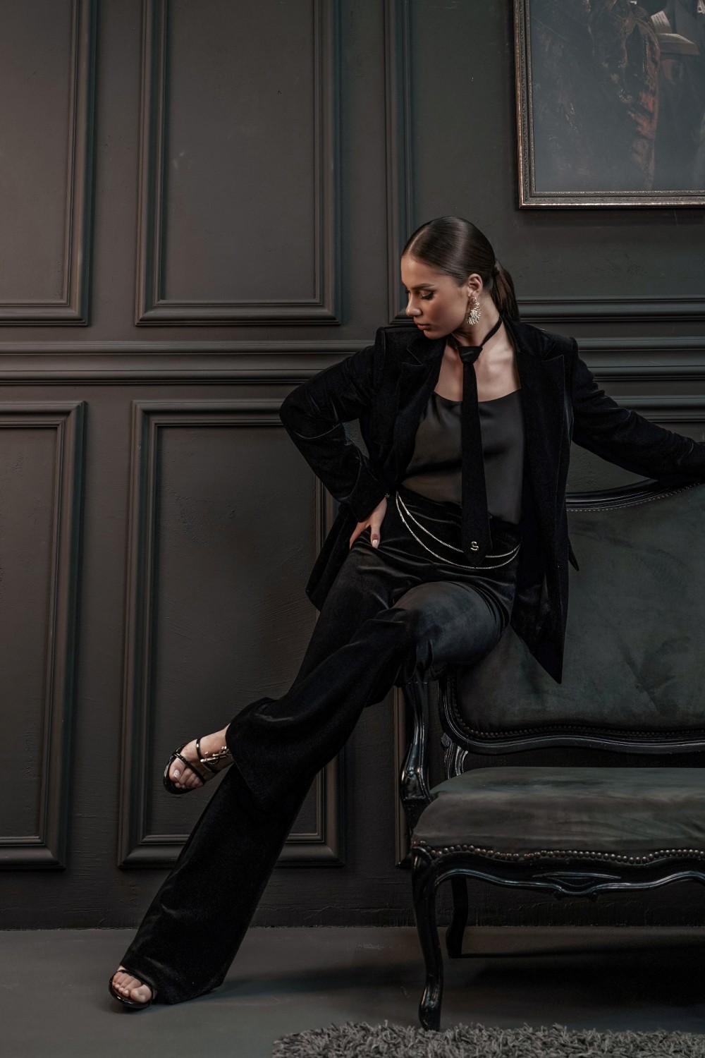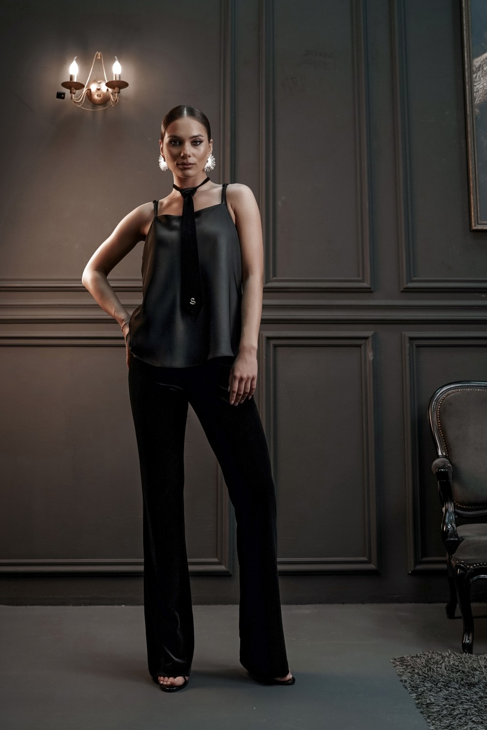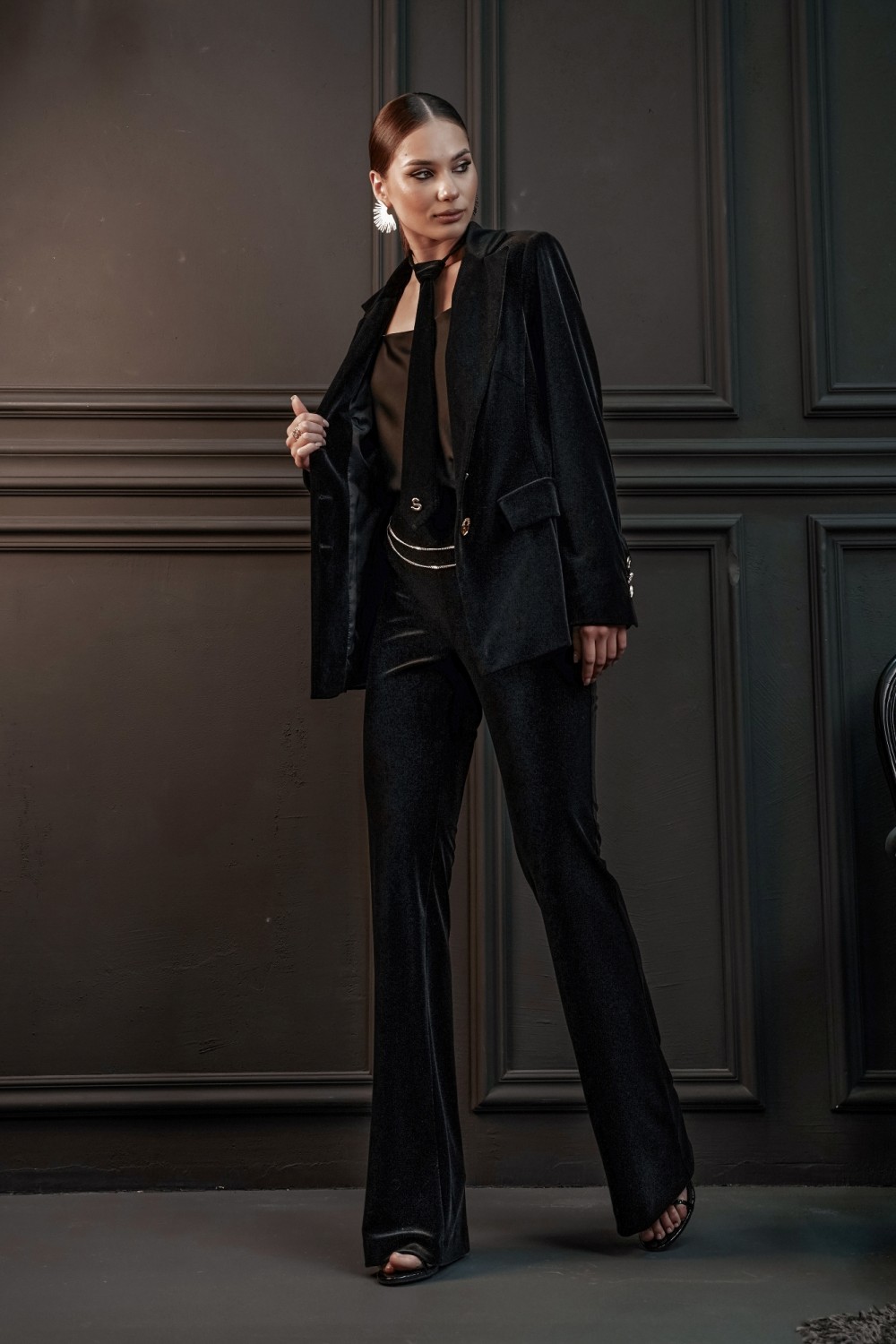 застежка в боковом шве на потайную молнию. Пояс брюк спереди декорирован