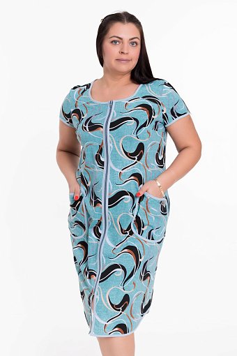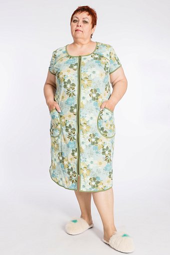 Халат с коротким рукавом выполнен из кулирки с набивкой. Центральная застёжка на молнию. Спереди расположены накладные карманы. Горловина, рукава, низ и борта халата обработаны отделочной бейкой.