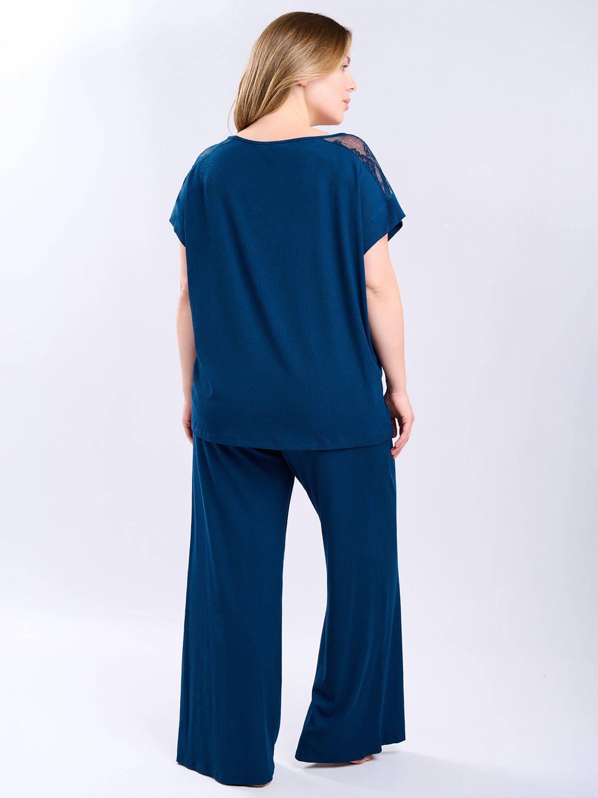 Женская пижама Indefini выполнена в насыщенном синем цвете из мягкой, приятной к телу вискозной ткани с добавлением эластана. Комплект включает в себя стильную топ-майку с V-образным вырезом и декоративными кружевными вставками на плечах, а также свободные широкие брюки на мягкой эластичной резинке.