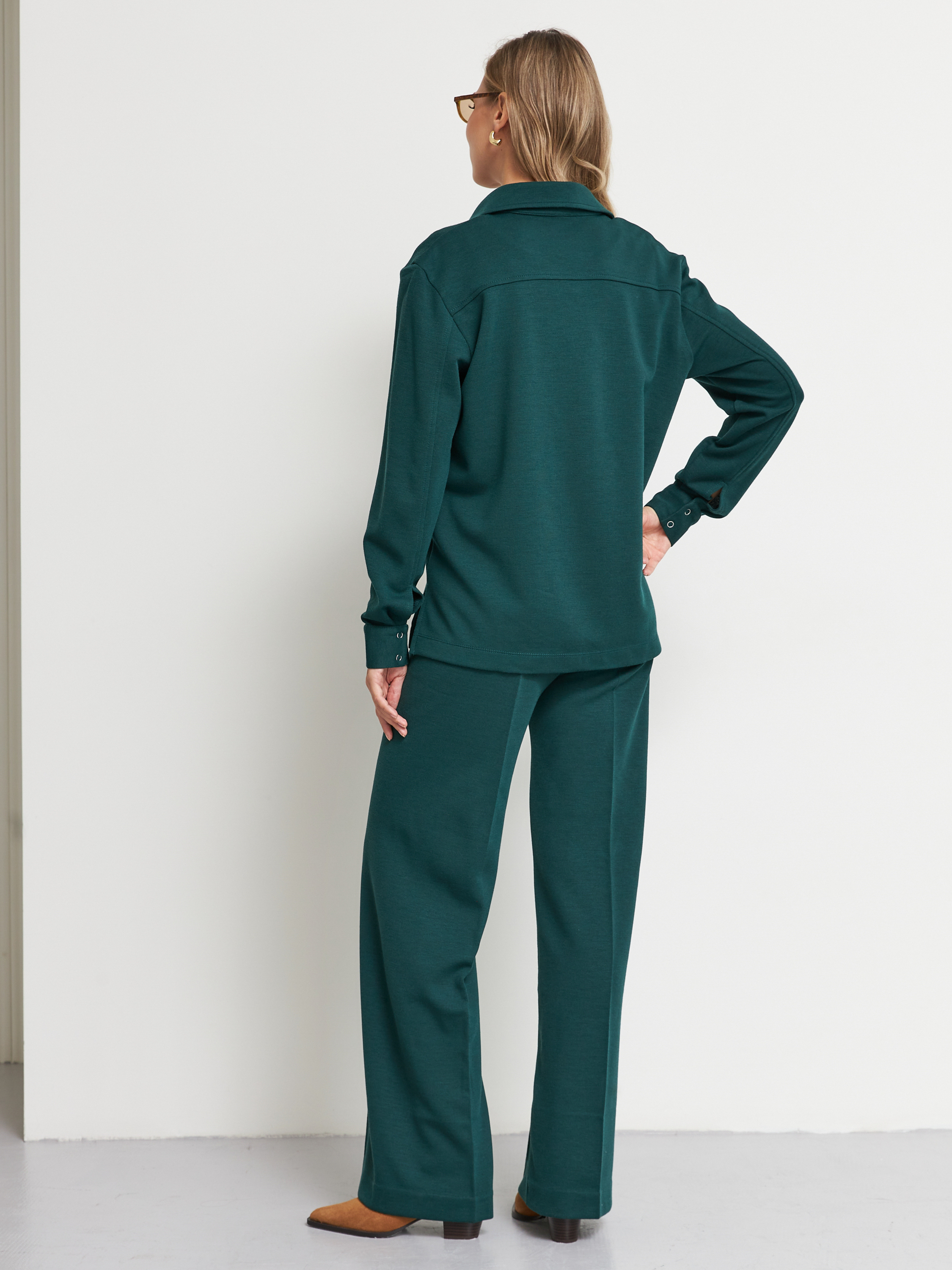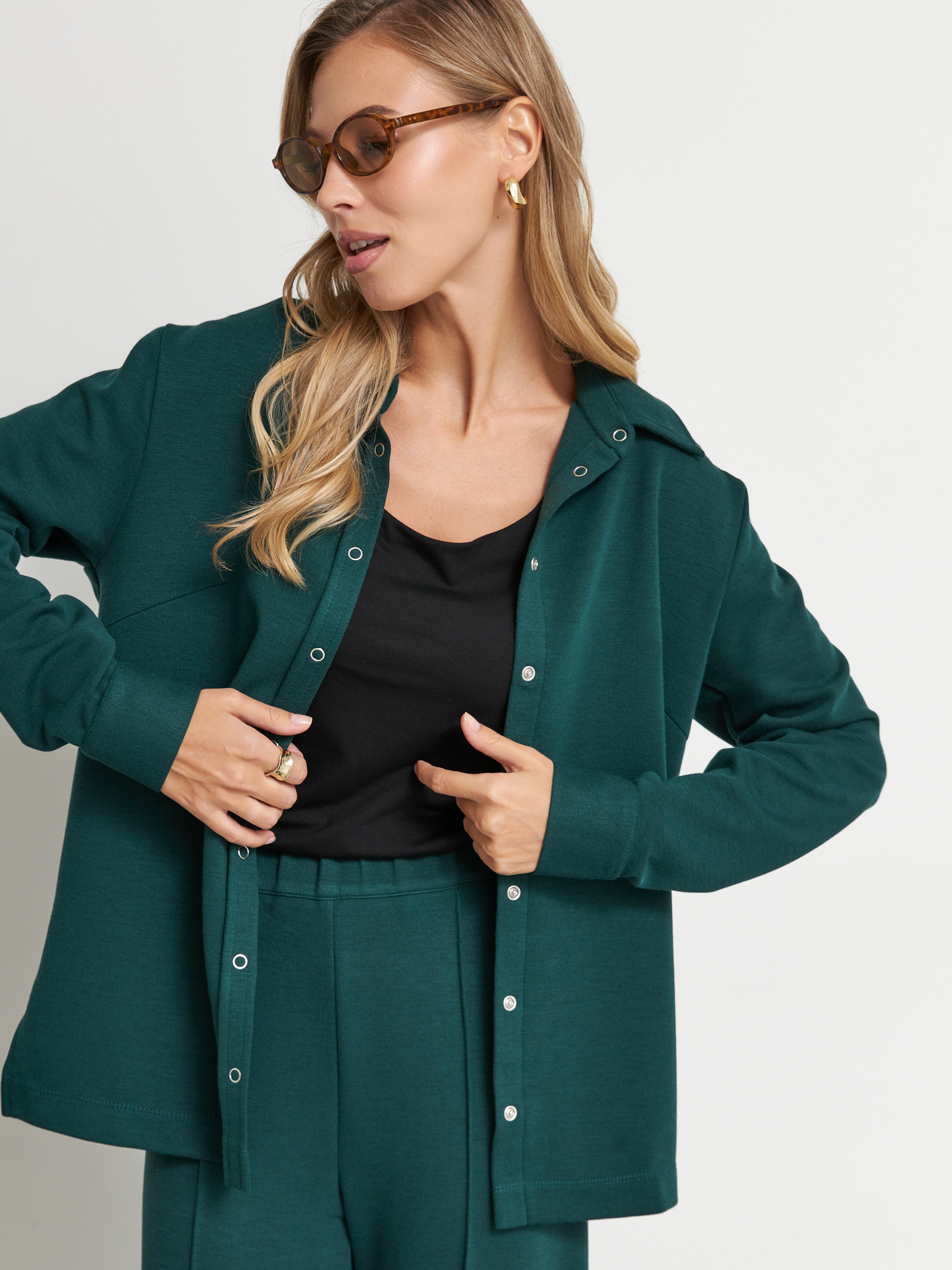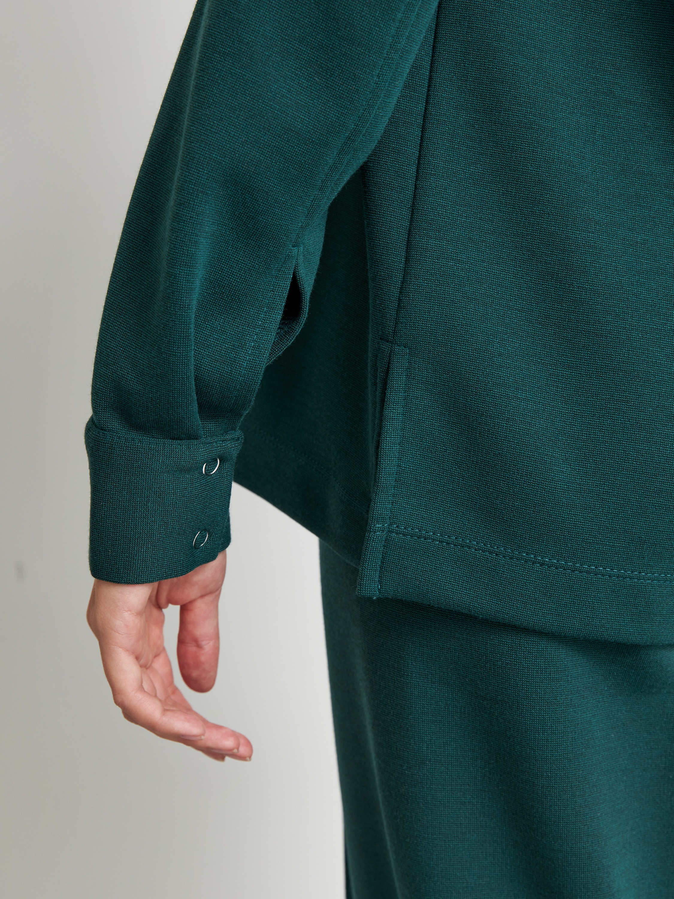 Жакет выполнен из эластичного полотна. Изделие в рубашечном стиле. Свободный силуэт с разрезами в боковых швах и застёжкой на планке. Вырез горловины обработан отложным воротником на стойке. Втачной рукав на манжете с застёжкой на кнопки.
