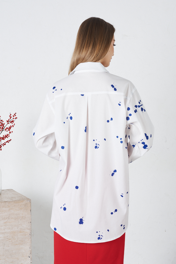 Рубашка свободного силуэта из вискозной ткани с застёжкой на пуговицы. Низ изделия асимметричной длины (спинка удлинена относительно переда) с закруглениями по бокам и разрезами. Рубашечный рукав на манжете с застёжкой на пуговицы. Вырез горловины обработан отложным воротником на стойке. На задней части изделия выполнена кокетка с небольшой складкой. Достоинство этой модели в способности скрыть некоторые недостатки фигуры. Её можно сочетать как с брюками, так и с джинсами.
