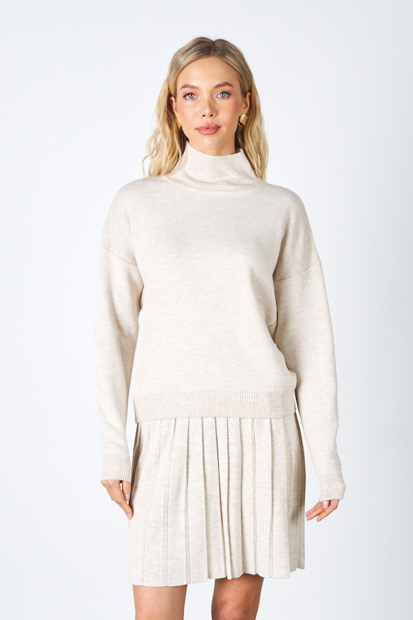 Костюм из джемпера и юбки. Джемпер свободного силуэта со спущенной линией плеча и длинным рукавом. Низ изделия и низ рукава оформлены резинкой, воротник-стойка. Юбка плиссе с эластичным поясом. Изделие выполнено из мягкой меланжевой пряжи.