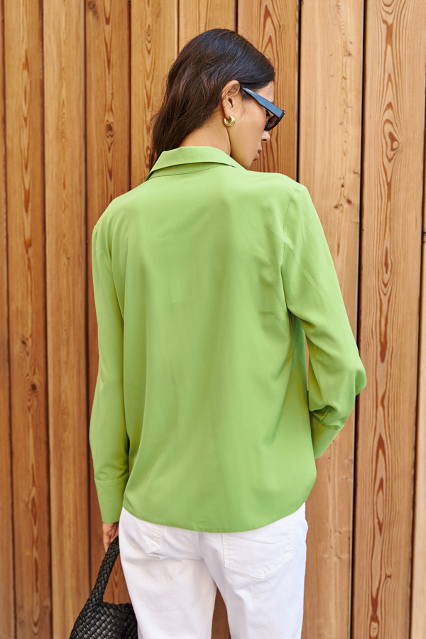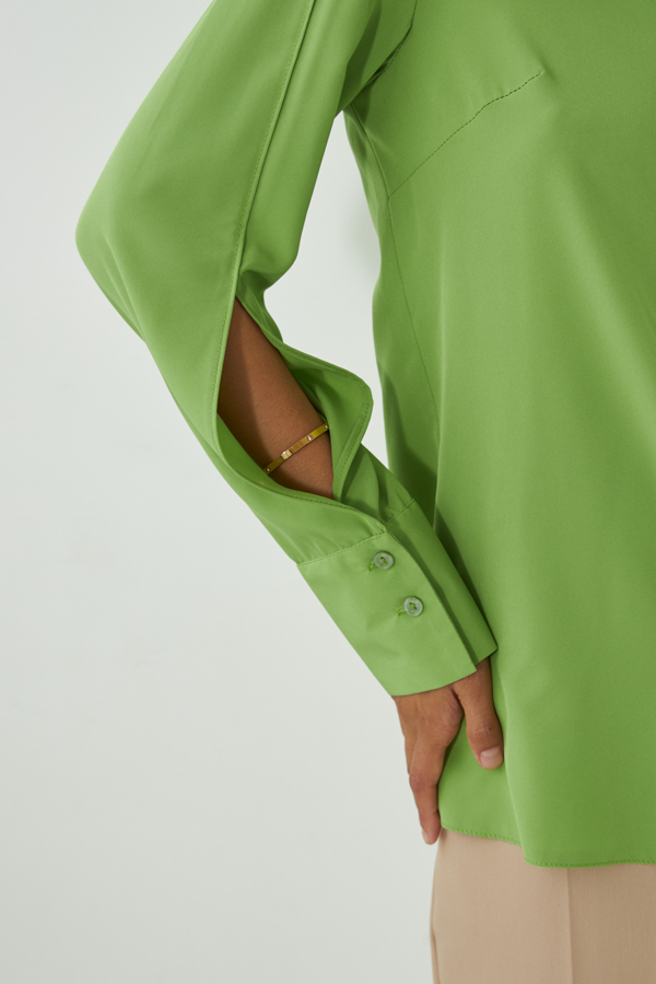 Блуза-рубашка из блузочной ткани. Свободный силуэт с застёжкой на пуговицы. Вырез горловины обработан отложным воротником на стойке. Оригинальный втачной рукав на манжете с застёжкой на пуговицы.