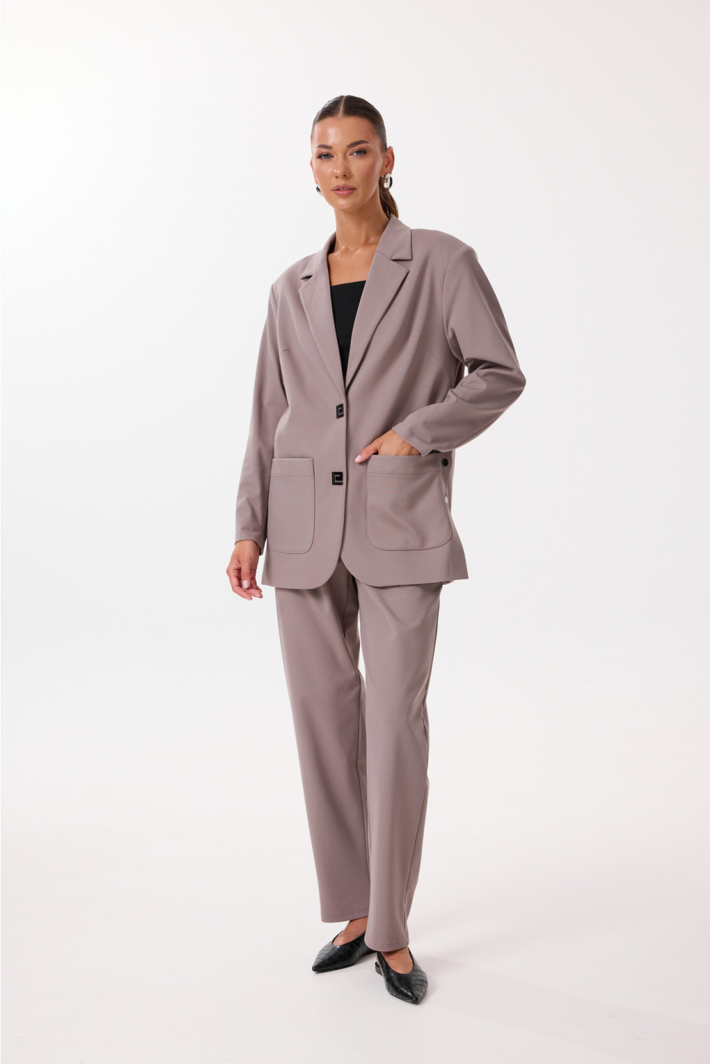 2209/1 Костюм 44-54 66 60% вискоза, 35% ПЭ, 5% спандекс Костюм женский, состоящий из жакета и брюк. Жакет женский, прямого силуэта, с центральной бортовой застежкой на кнопки, на подкладке. По переду настрочены накладные карманы, застрочены вытачки. Спинка с кокеткой. Боковые срезы обработаны в виде высоких шлиц, застегивающихся на кнопки. Плечо спущено. Рукав двухшовный, длинный. Брюки женские, прямые, к низу слегка заужены. По переду обработан фигурный карман с наклонным входом, отстрочена имитация застежки на молнию. Верх брюк обработан притачным поясом с резинкой и декоративной шнуровкой. Декоративные элементы и фурнитура могут отличаться от заявленных на фото. Цвет материала может отличаться по тону в зависимости от настроек вашего монитора! Длина жакета по спинке 44р. - 74 см, 54р. - 75 см. Длина брюк по боковому шву 104 см. 44-54