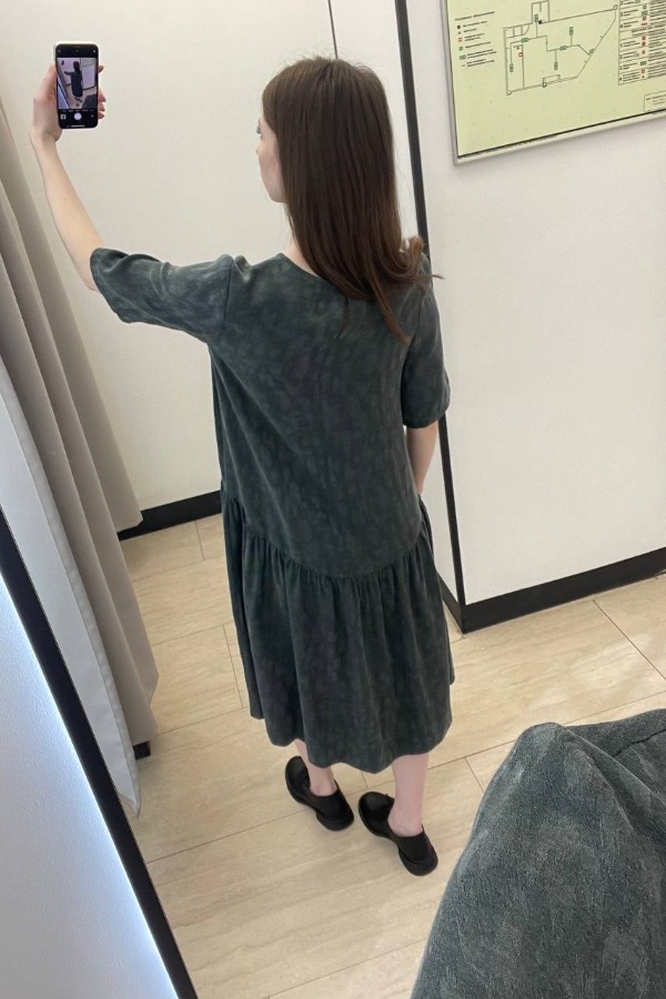 Платье свободного силуэта из плательной ткани с фактурной матово-блестящей поверхностью. Изделие отрезное по линии бедра спереди и чуть ниже бедра на задней части. Верхняя часть юбки со сборкой. Втачной короткий рукав. Круглый вырез горловины оформлен косой бейкой из основной ткани. Сзади по среднему шву застежка-пуговица. В таблице размеров представлены параметры человека, а не изделия.