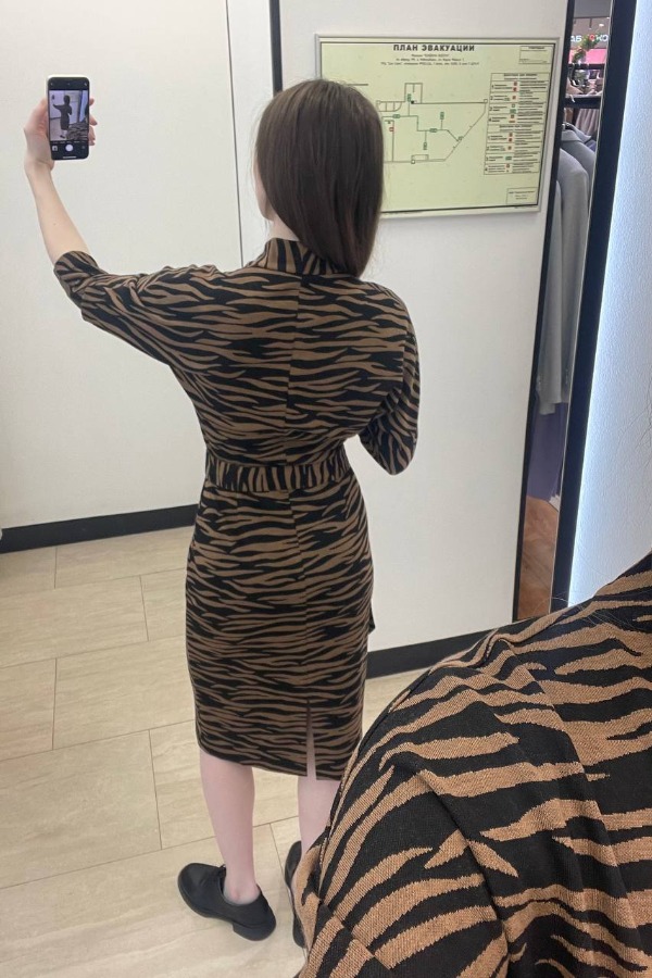 Платье из эластичного полотна с жаккардовым узором. Изделие свободное в верхней части и прилегающее в области талии и бёдер. Лиф изделия оригинального кроя в стиле кимоно. Цельнокроеная стойка переходящая в запах, визуально делает фигуру стройнее. По центру задней части платья выполнен шов, снизу небольшой разрез. В комплекте пояс. В таблице размеров представлены параметры человека, а не изделия.