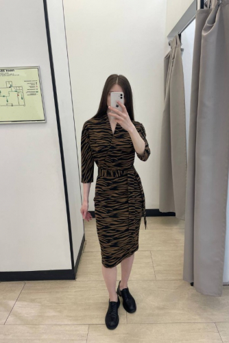 Платье отрезное по линии талии из эластичного полотна. Изделие свободное в верхней части и полуприлегающее в области талии и бёдер. Глубокий V-образный вырез горловины плавно переходит в запах, фиксируется притачным поясом. Рукав оригинального кроя в стиле кимоно. В таблице размеров представлены параметры человека, а не изделия.