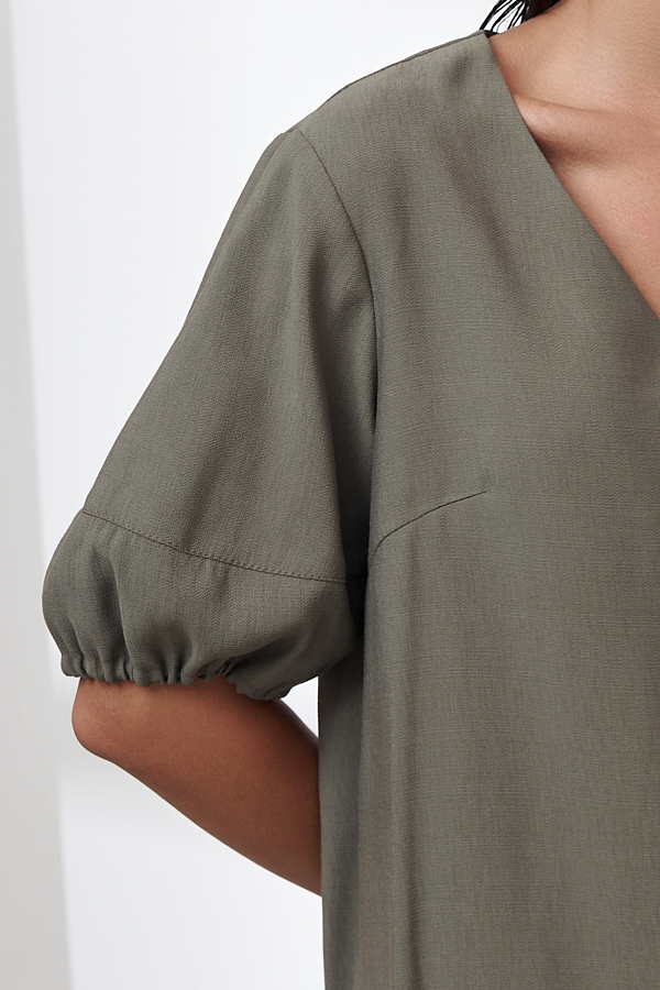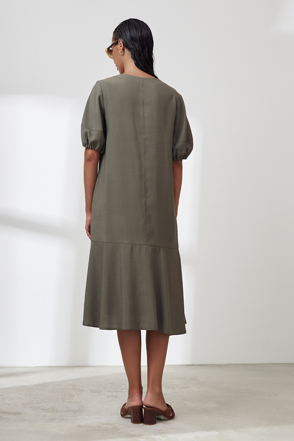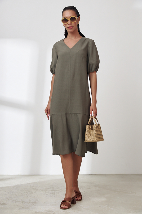 Платье свободного силуэта из вискозной ткани с крэш-эффектом. По центру передней части изделия и спинки выполнен шов. Цельнокроеная стойка, переходящая в V-образный вырез горловины, визуально делает фигуру стройнее. Втачной короткий рукав, по низу рукава сборка на резину. Низ изделия украшен широким воланом.