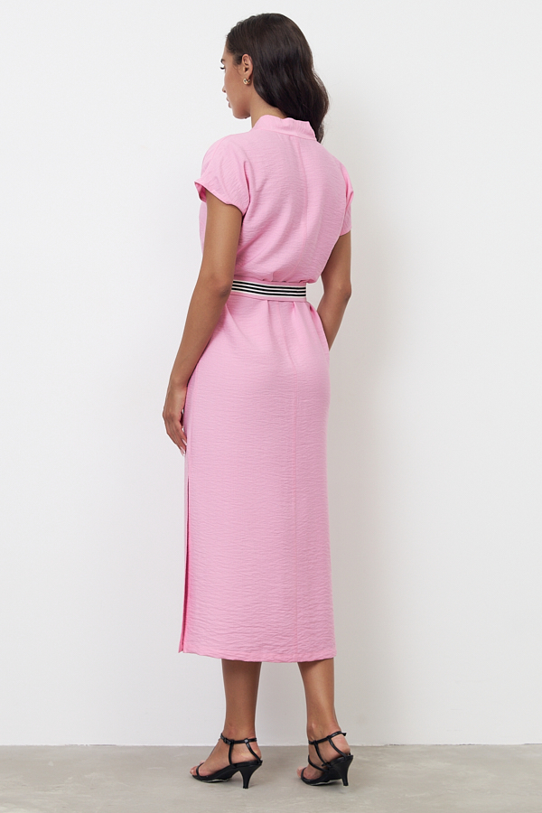 Платье из вискозной ткани с крэш-эффектом. Свободный силуэт с разрезом в боковом шве. По центру передней и задней части изделия выполнен шов. Цельнокроеная стойка, переходящая в V-образный вырез горловины, визуально делает фигуру стройнее. Цельнокроеный короткий рукав. В комплекте пояс из основной ткани с декоративной тесьмой.