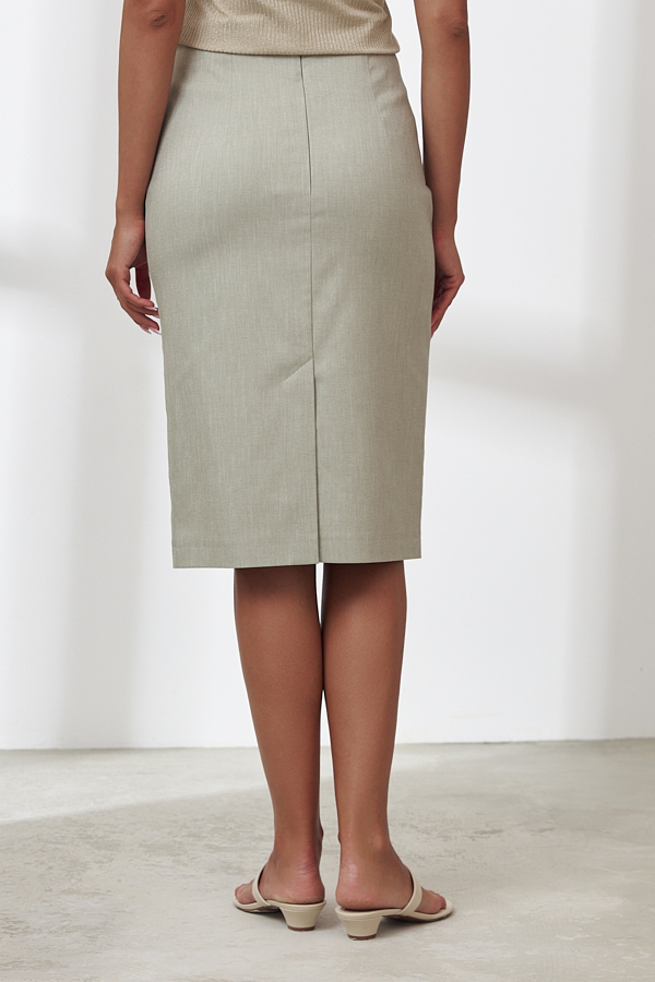 Юбка прилегающего силуэта из меланжевой костюмной ткани. Сзади по среднему шву застёжка-молния, снизу шлица с разрезом. Изделие без пояса, верхний срез обработан обтачкой. На передней и задней половине юбки выполнены талиевые вытачки. Юбка на притачной подкладке.