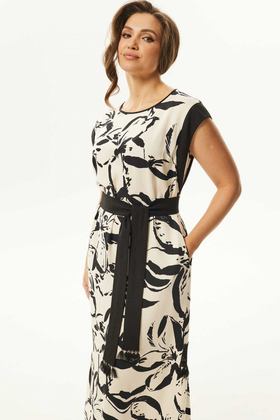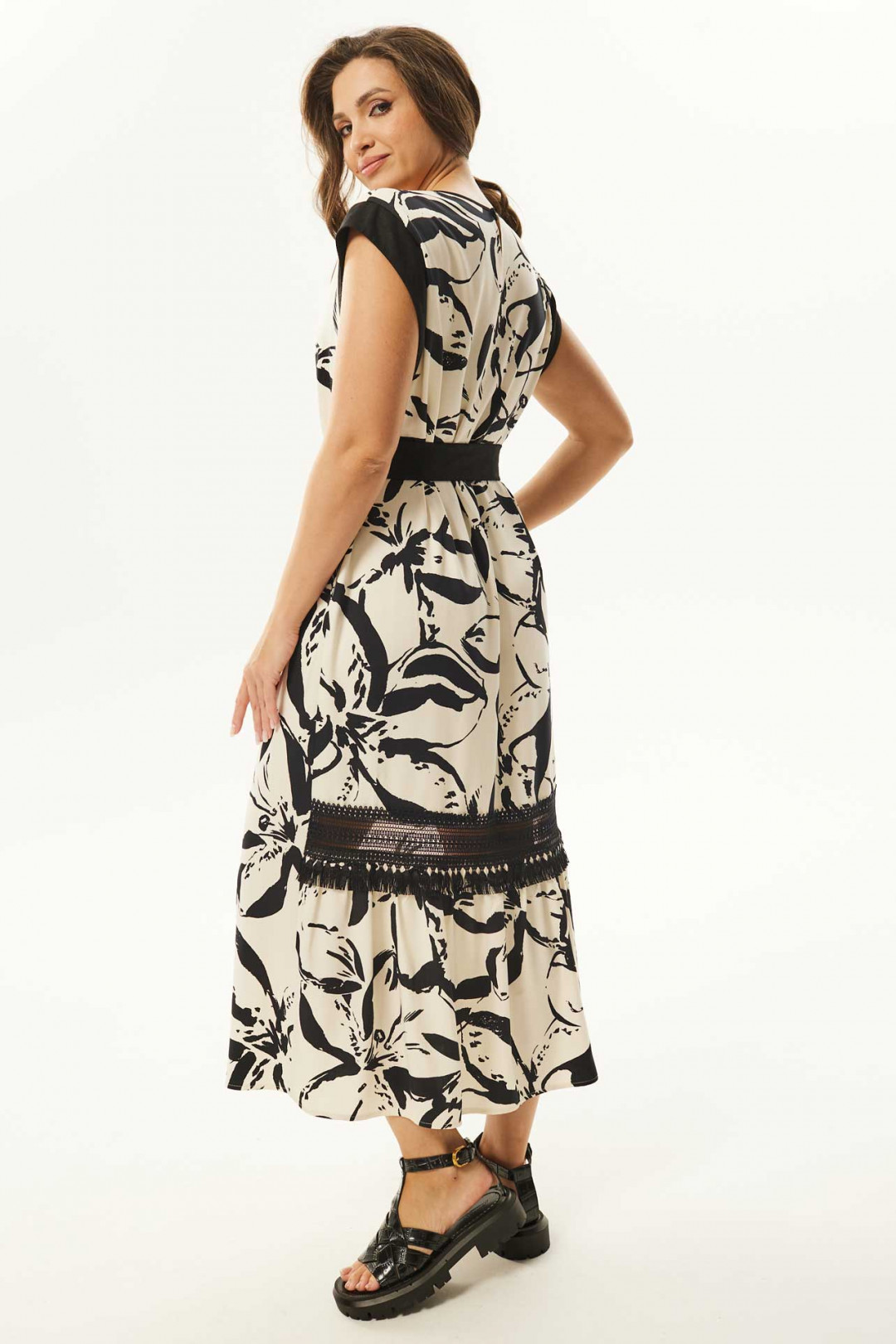 Платье женское свободного силуэта. По переду нагрудные вытачки. По спинке застёжка на воздушную петлю и пуговицу. По низу спинки платья широкая оборка с декоративным широким кружевом. Горловина круглая оформлена отделочным кантом. Рукава небольшие «крылышки». В боковых швах карманы. Платье без подкладки. Дополнением служит пояс.