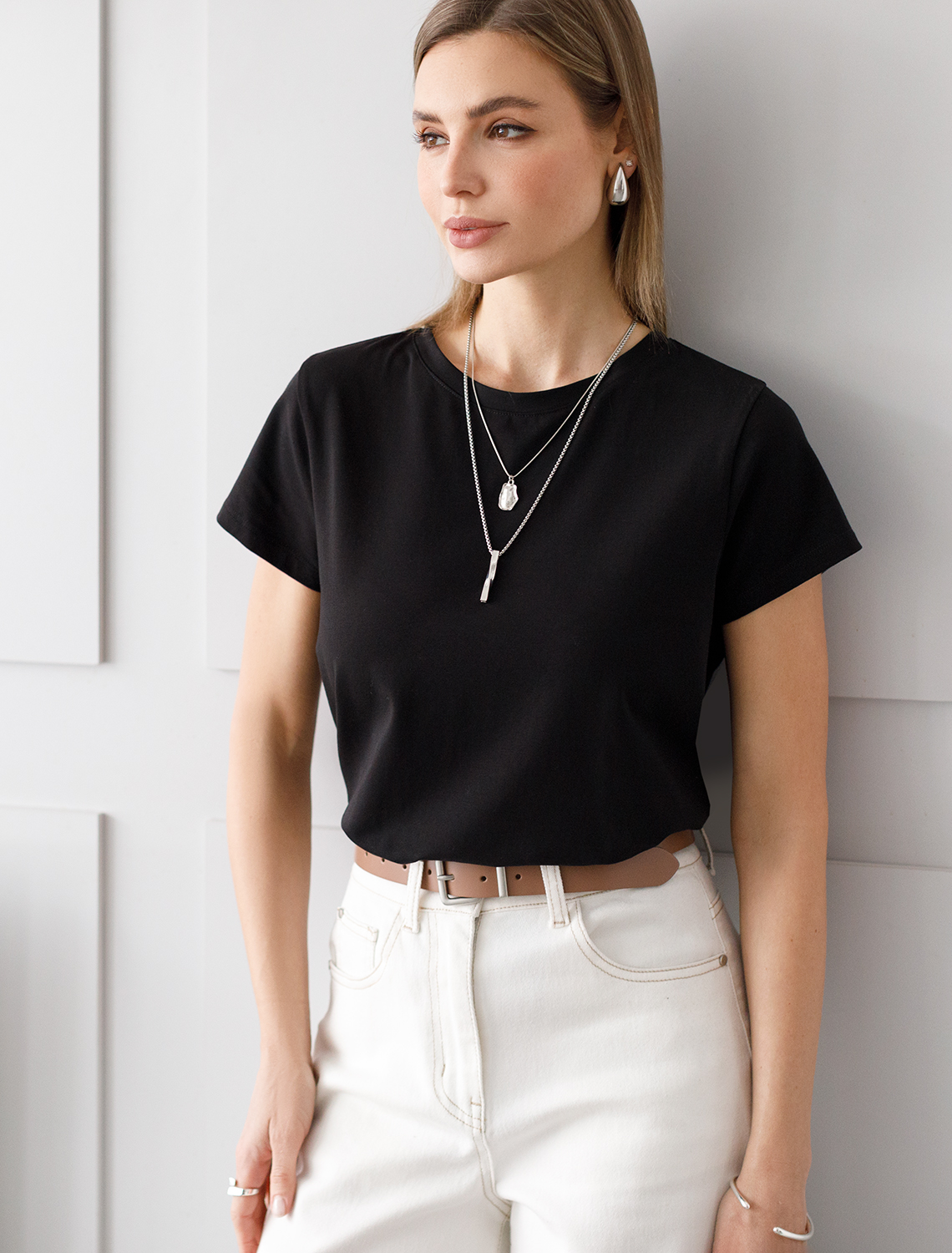 Футболка из облегченного хлопкового полотна с эластаном Футболка выполнена из премиального хлопка. Базовая модель, которая хорошо будет сочетаться в гардеробе с любым низом и за счет посадки по фигуре, любым дополнительным верхом вне зависимости сезона. Эластан в составе способствует формоустойчивости и меньшей сминаемости. Изделие украшено логотипом бренда.
