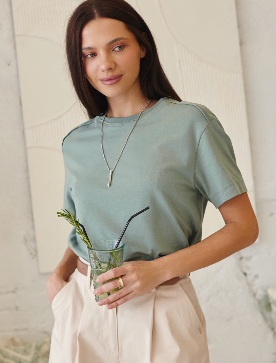 Футболка с открытым срезом из премиального хлопка с эластаном Футболка выполнена из премиального хлопка. Базовая модель, которая хорошо будет сочетаться в гардеробе с любым низом и любым дополнительным верхом вне зависимости сезона. Эластан в составе способствует формоустойчивости и меньшей сминаемости. Изделие украшено трендовым открытым срезом и логотипом бренда.
