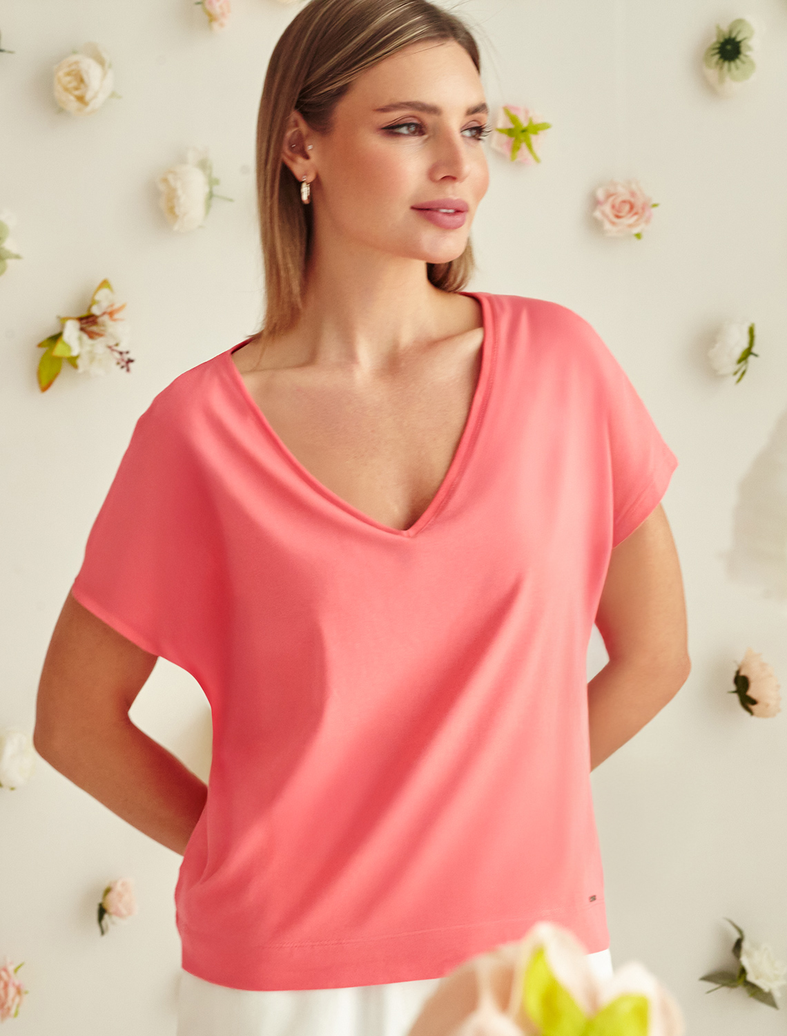 Футболка из премиального хлопка Футболка с цельнокроеным рукавом выполнена из премиального хлопка. Базовая однотонная модель идеально впишется в любой гардероб. V-вырез подчеркивает ключицы и удлиняет шею, хорошо сочетается с жакетами или кардиганами. Изделие дополнено металлическим логотипом бренда.