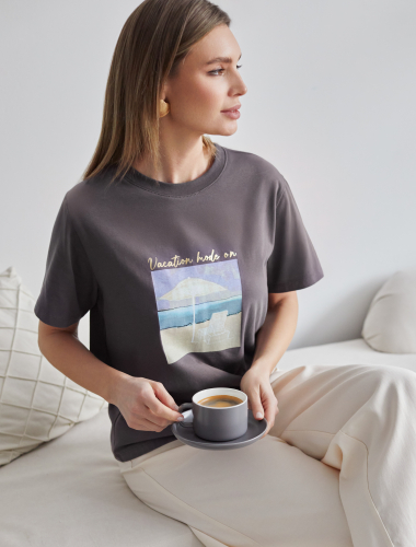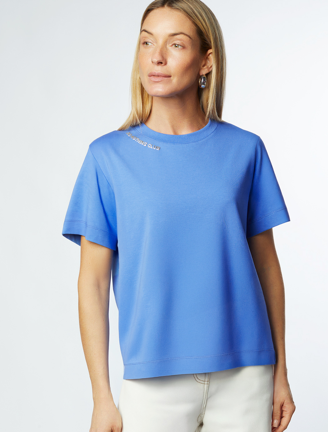 Футболка из премиального хлопка с принтом фольгой Перевод принта: Do nothing club - клуб любителей отдыха. Футболка выполнена из премиального хлопка с эластаном. Фактурный принт нанесен фольгой с устойчивым покрытием. Модель среднего объема легко впишется в повседневные аутфиты и добавит акцента в образы. Эластичный материал гарантирует комфорт и формоустойчивость. Изделие дополнено металлическим логотипом бренда.