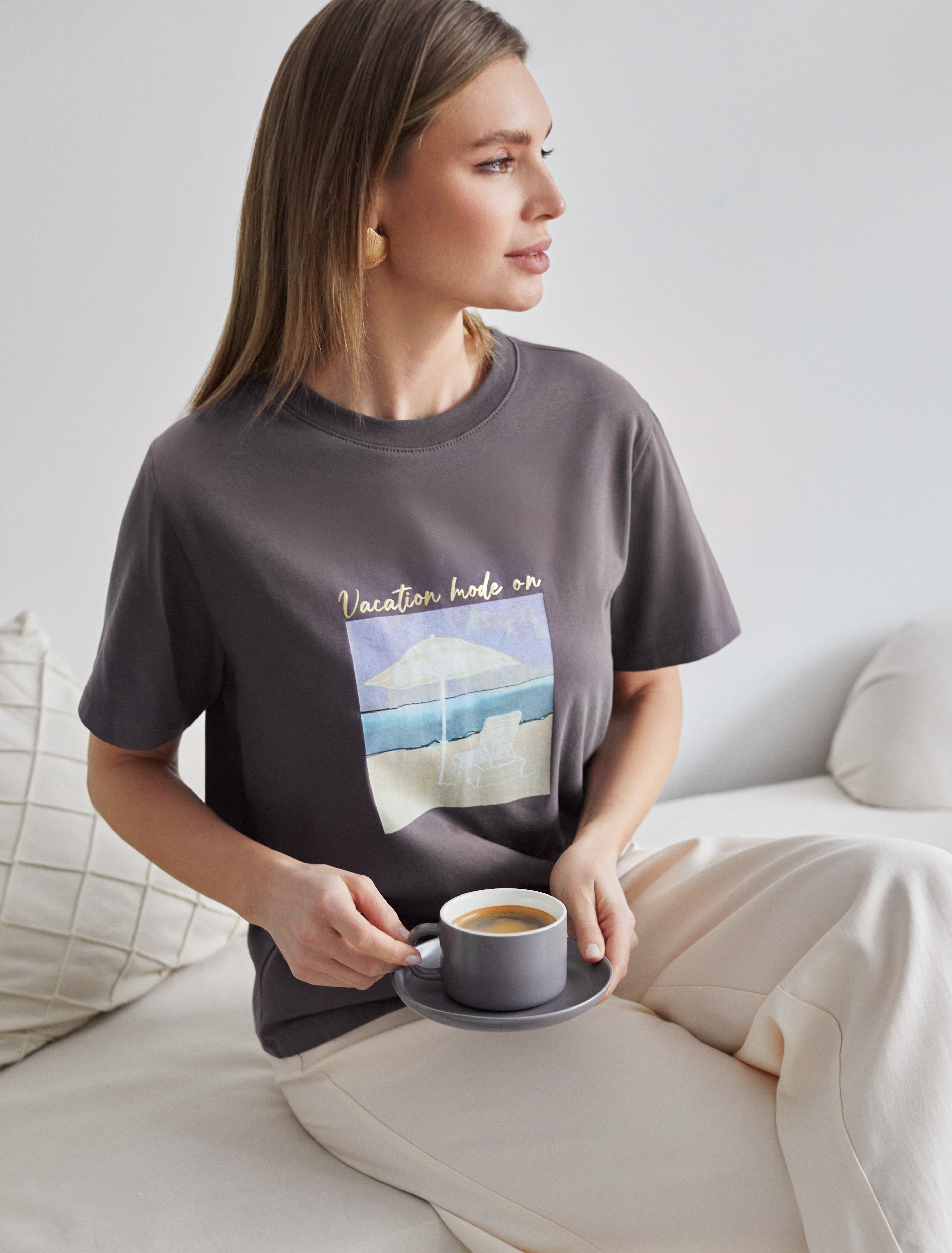 Футболка из хлопкового облегченного полотна с авторским принтом Перевод надписи: «Vacation mode on - в режиме отпуска»