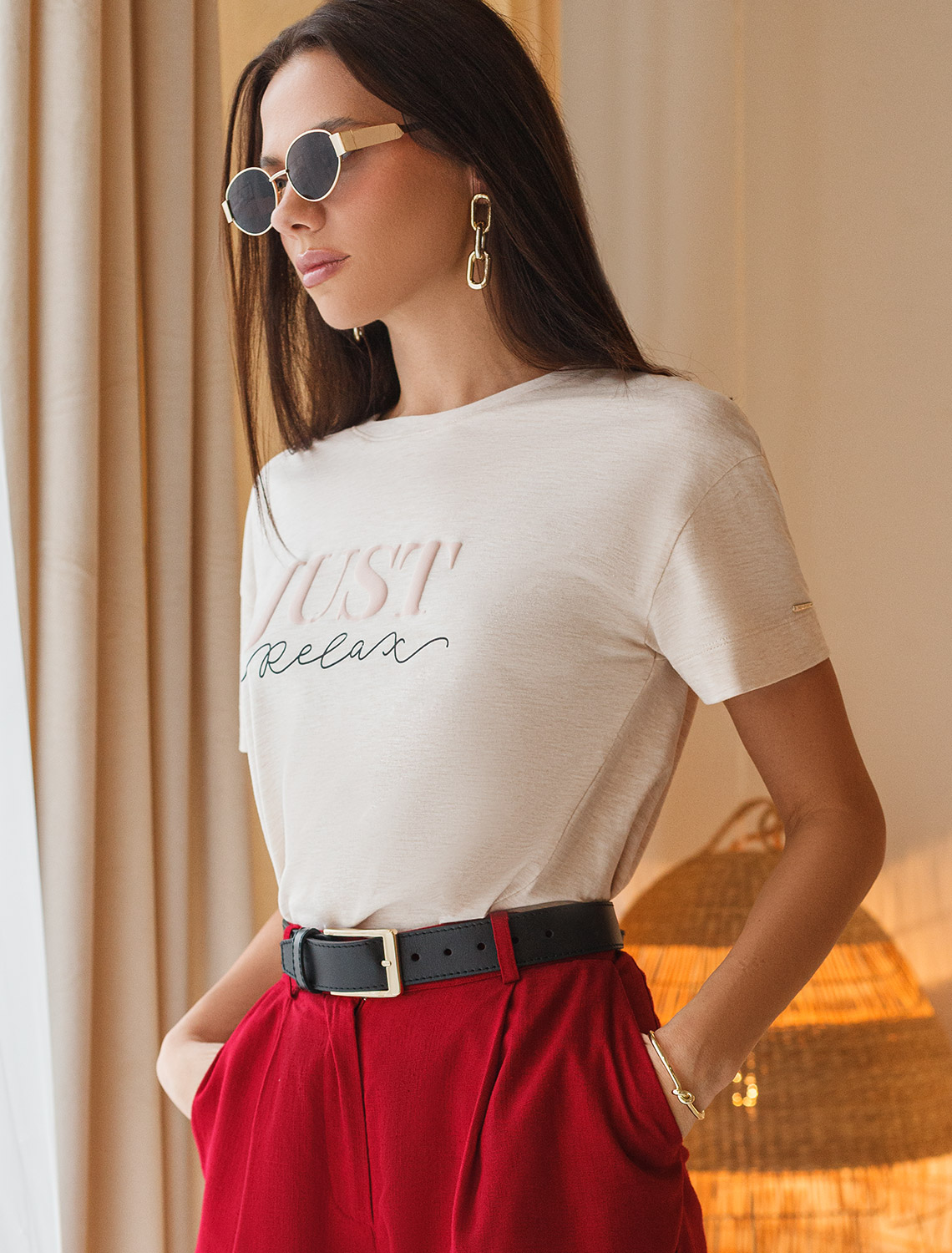 Футболка из премиального хлопка с авторским принтом Футболка выполнена из премиального хлопка с авторским принтом. Just relax – «Просто расслабься» Свободная модель дополнена двумя вертикальными рельефами, заканчивающиеся разрезами. Мягкий эластичный хлопковый трикотаж гарантирует исключительный комфорт и уют дома. Идеально сочетается в костюме с брюками D44.131