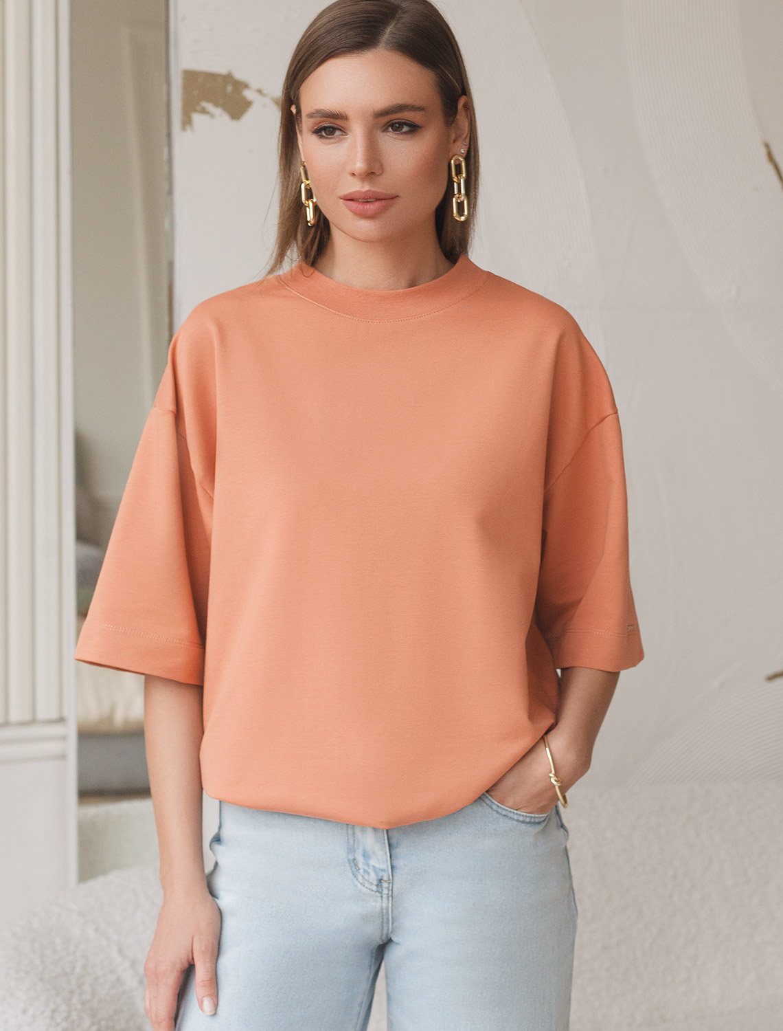 Свободная футболка из тонкого премиального футера с эластаном Футболка свободного кроя выполнена из эластичного футера-двухнитки. По низу изделие дополнено регулируемым шнуром из репсовой ленты с металличекой фурнитурой. За счет наличия эластана, ткань хорошо держит форму, не вытягивается и гарантирует абсолютный комфорт. Сочетается в костюме с брюками D44.140 и D44.143