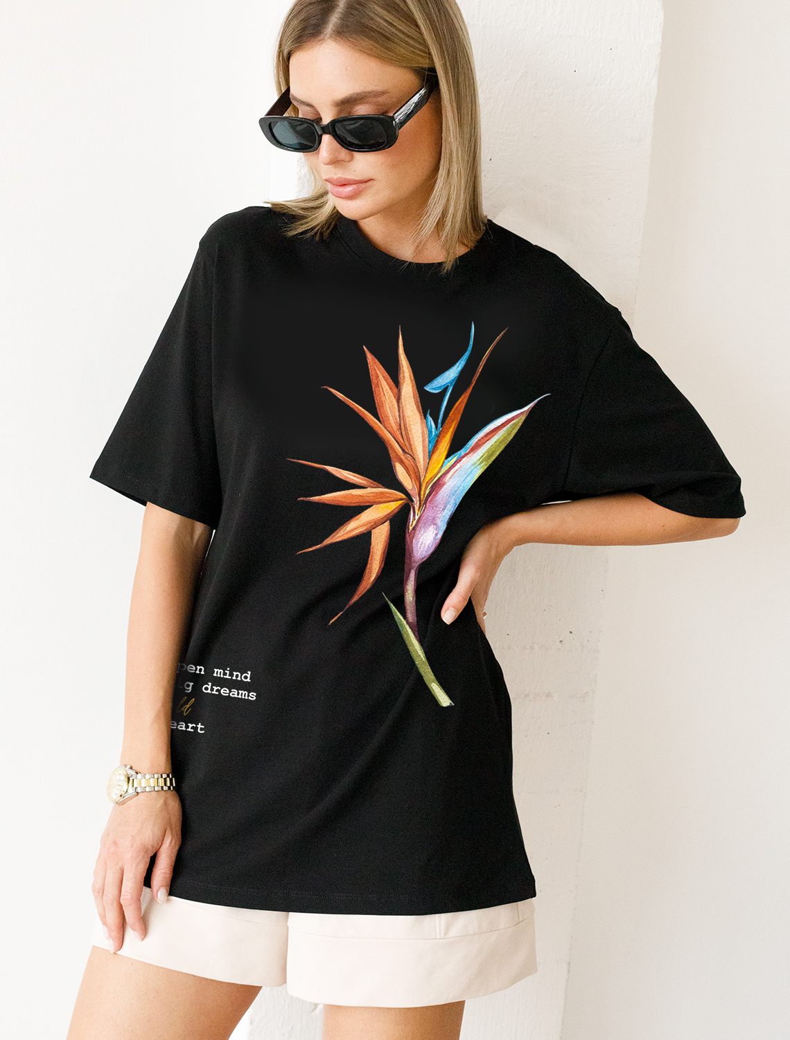 Удлиненная футболка over-size с авторским принтом Футболка свободного кроя выполнена из премиального хлопка. Авторский принт нанесен красками с устойчивым покрытием. Перевод: «Open mind, big dreams, wild heart - Широкий взгляд, большие мечты, свободное сердце» Наличие эластана в составе гарантирует абсолютный комфорт и долговечность изделия. Модель дополнена металлическим логотипом бренда.