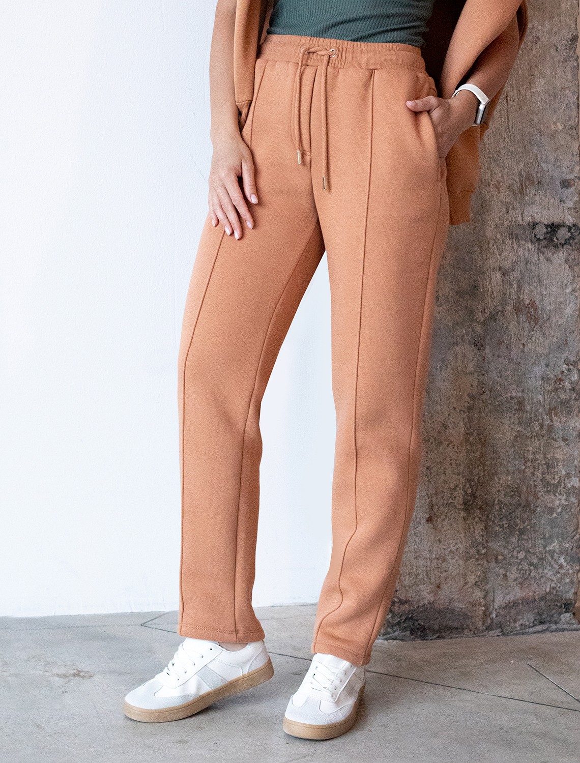 Брюки из футера-трехнитки с начесом Брюки выполнены из премиального футера-трехнитки. Модель с начесом дополнена боковыми карманами и эластичным поясом на резинке с хлопковым шнуром. Вертикальные швы имитирующие стрелки визуально вытягивают силуэт. Соберите костюм вместе с джемпером D49.966 и D49.964
