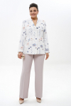 Блузка прямого силуэта, с застёжкой по цельнокроеной потайной планке на петли пуговицы, по боковым разрезы. Перед с нагрудными выточками, верху с оборками декорированы отделочной тесьмой. Рукава втачные, одношовные, длинные, понизу с разрезом, сборкой и притачными манжетами застёгивающиеся на две петли и пуговицы. Воротник стояче-отложной на отрезной стойке, застёгивающийся на петлю и пуговицу.