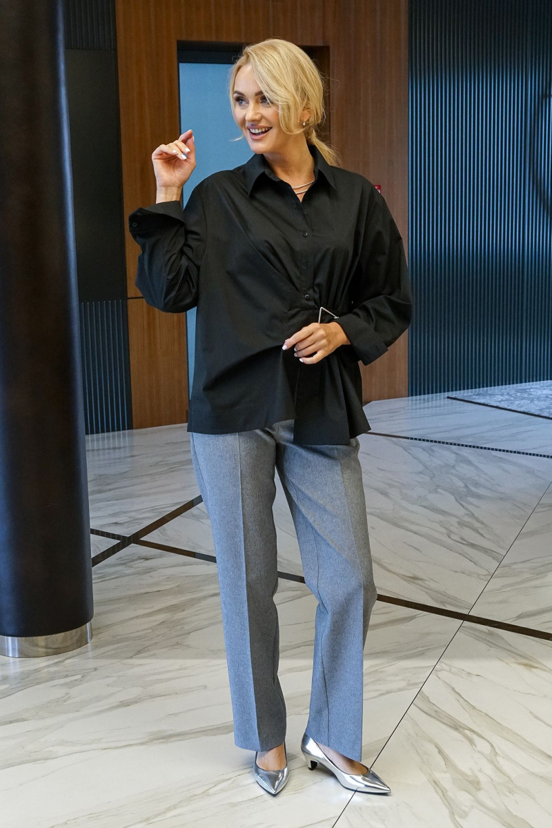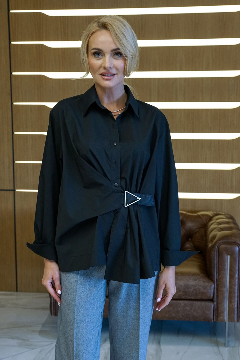 Блузка прямого, свободного силуэта, с застёжкой по переду с втачными планками (доходящей до линии талии) на петли, пуговицы и отделочный пояс с пряжкой, со спущенной линией плеча. Низ обработан широкой обтачкой, разноуровневый. Правая часть переда с залаженными мягкими складками, левая часть со сборкой. Спинка с притачной кокеткой и мягкими складками. Рукава втачные, одношовные, длинные, понизу с разрезом, мягкими складками, притачными манжетами на петли, пуговицы. Воротник стояче-отложной на отрезной стойке с петлёй и пуговицей.