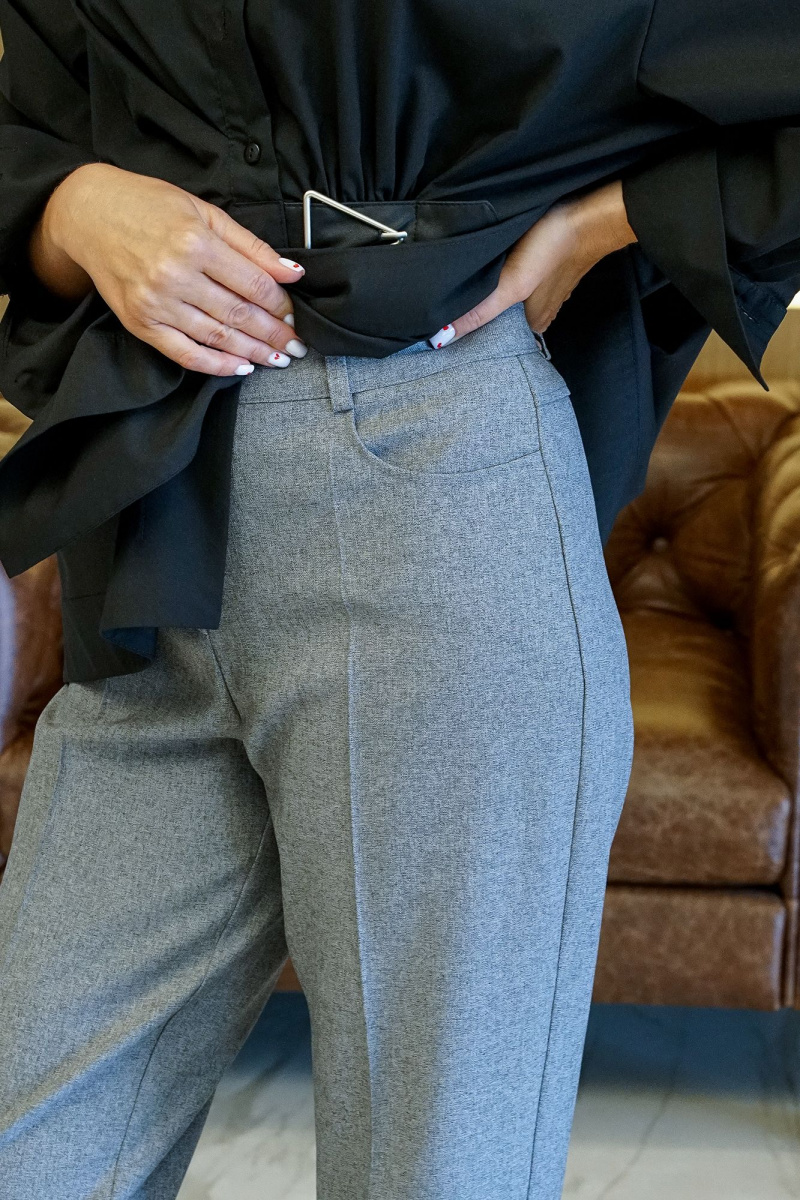 Брюки прямого силуэта, со сгибом, на притачном поясе со шлёвками (Р52 с резинкой по боковым). Застежка типа «гульфик» на молнию и по краю пояса на петлю, пуговицу. Передние части с фигурными боковыми карманами. Задние части с притачной кокеткой.
