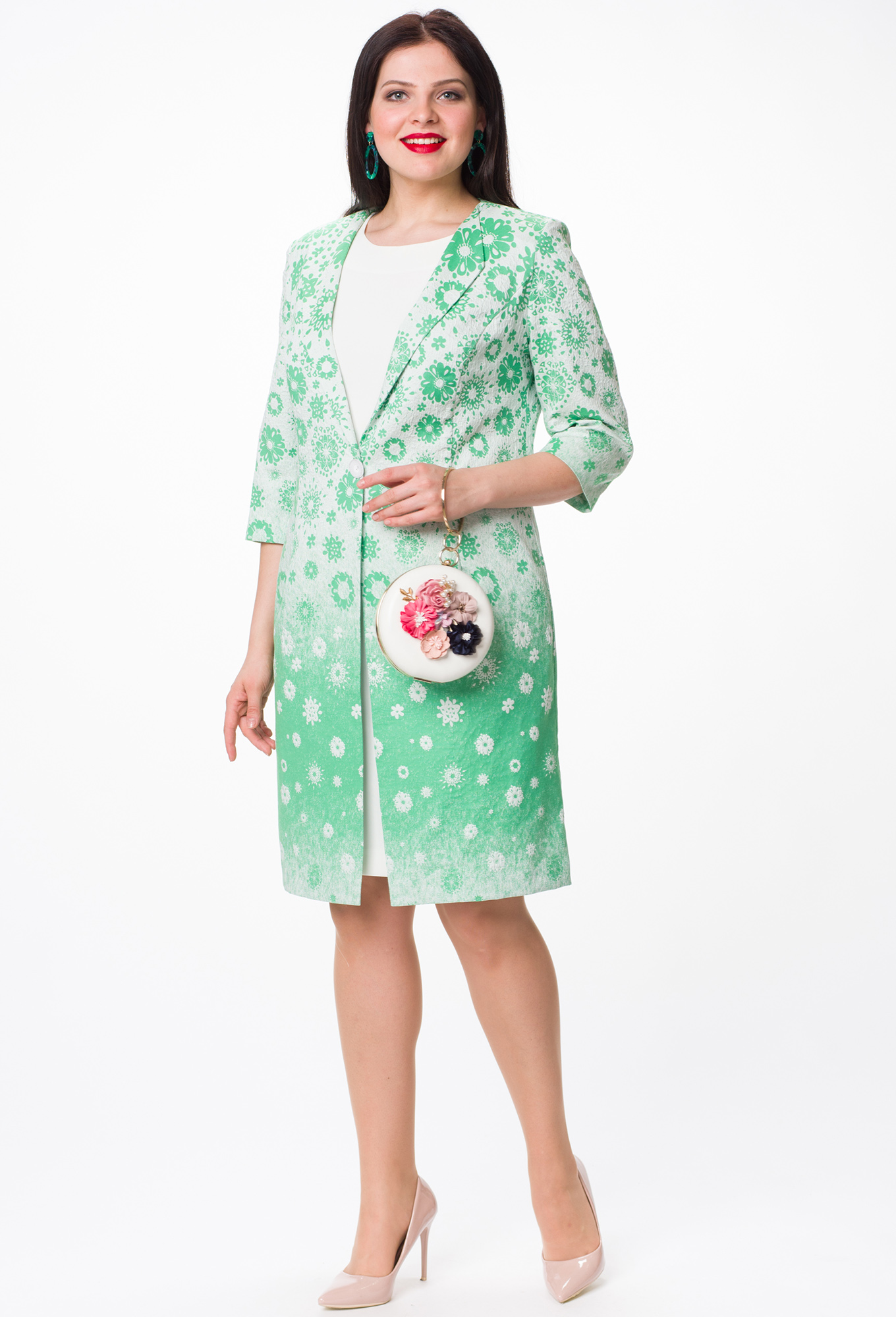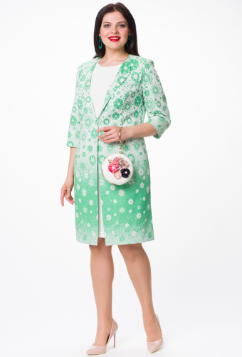 Кардиган из турецкого жаккарда без подкладки. Имеет отложные борта и застежку на одну пуговицу. Рукав втачной.