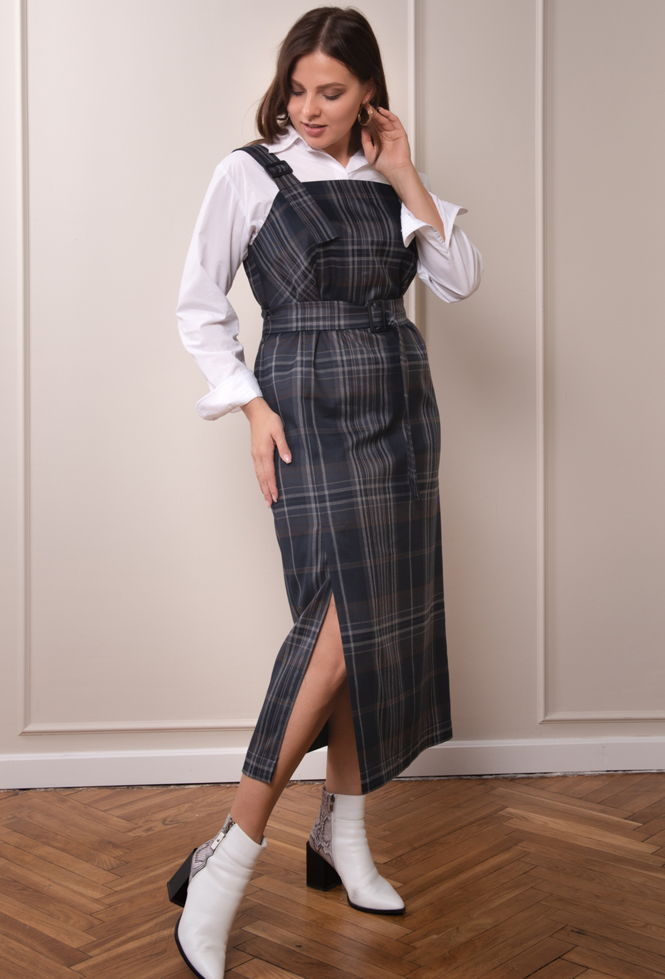 Очень женственный сарафан в клетку выполнен из плотной, приятной на ощупь ткани .Несмотря на смесовый состав очень устойчиво к сминанию и заломам. Это позволит избежать затяжек и надолго сохранит презентабельность изделия. Отсутствие рукава даст возможность сочетать платье с лонгсливом ,рубашкой или поиграть на контрасте. На весеннее межсезонье это очень актуальная и практичная модель с оригинальным поясом, дополненным пряжкой. Рельефы, вытачки и отрезная линия талии формируют притягательный силуэт и обеспечивают идеальную посадку на фигуре.