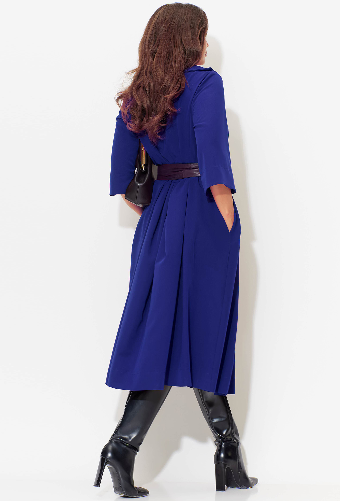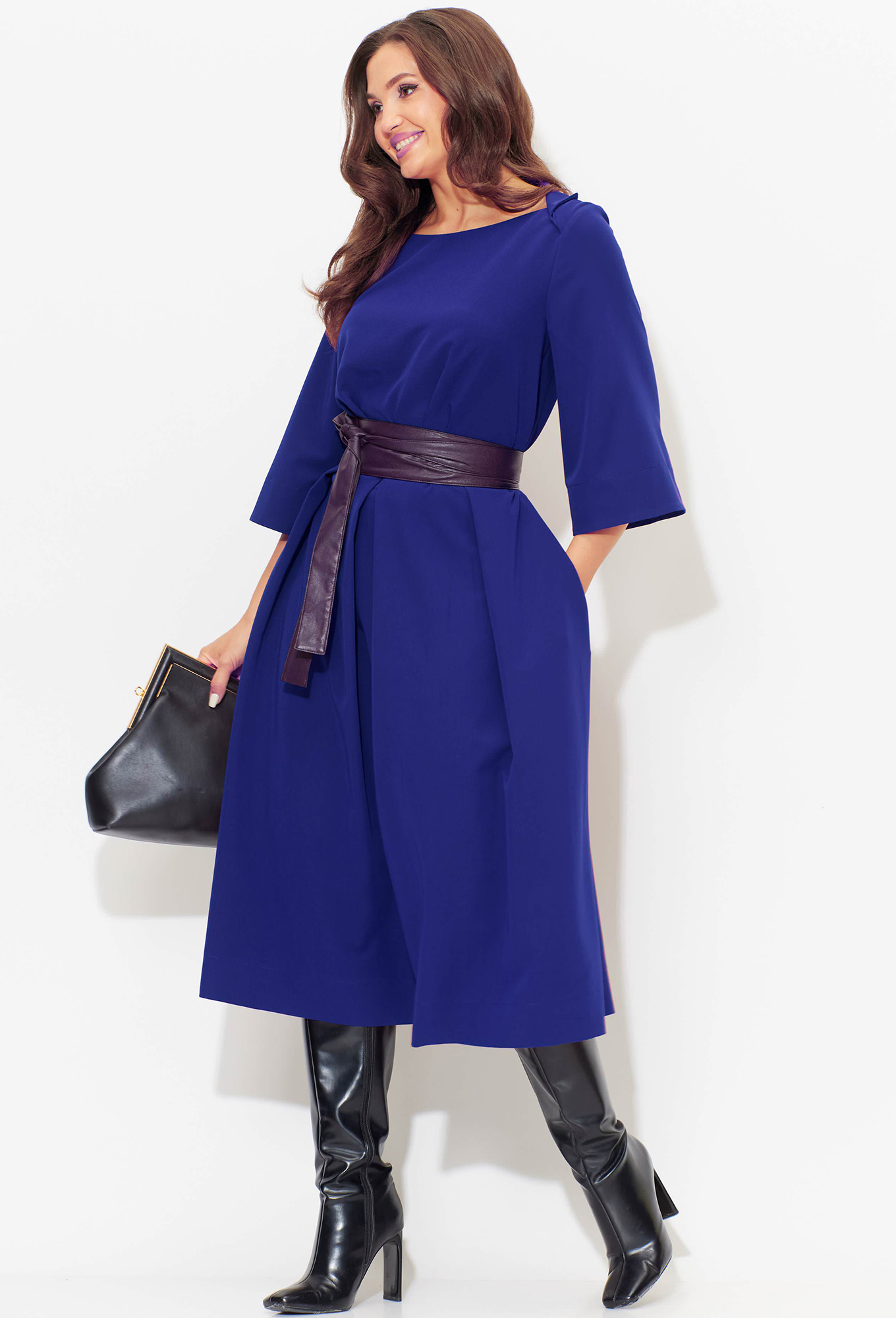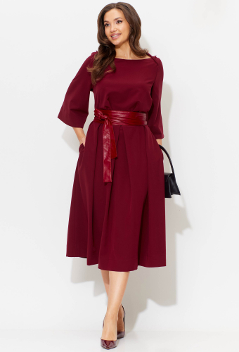 Шикарное женское платье идеально на любую погоду: под босоножки либо под сапоги и пальто. Отличный вариант универсального изделия: подойдет как для повседневного и офисного гардероба, так и для праздничного выхода. Отрезное по линии талии. По полочке объем груди создается за счет направленных складок из подреза. Объем юбки создается за счет центральной встречной и 2-х односторонних складок. По бокам в юбке- карманы. Рукав втачной, 3/4 длинны с отворотом. Вырез горловины лодочка с отложным воротником. В комплекте съемный пояс.