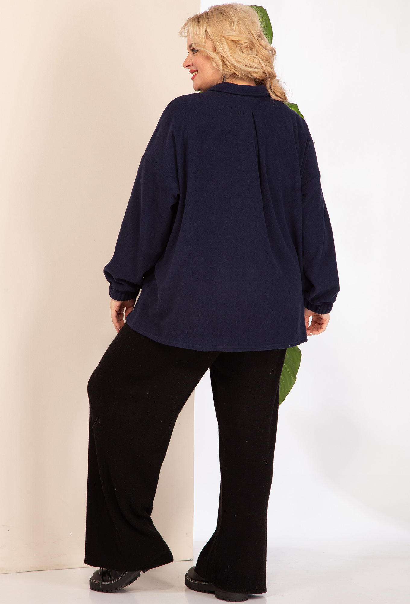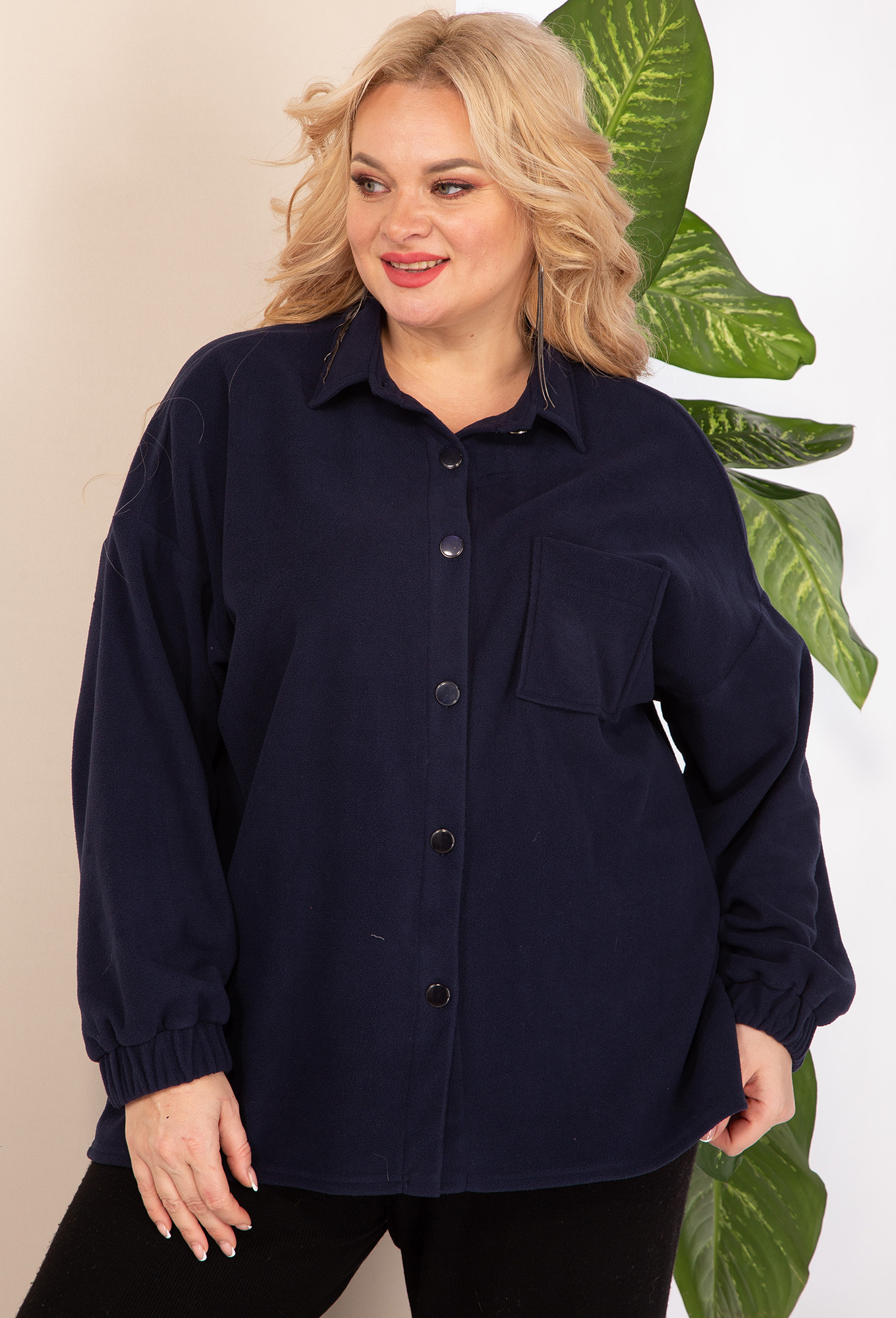 Блузка женская, прямого силуэта, из флисовой ткани со спущенным плечом. Застежка модели на планку и пуговицы, воротник на стойке, по полочке идет накладной карман, манжет рукава на резинке.