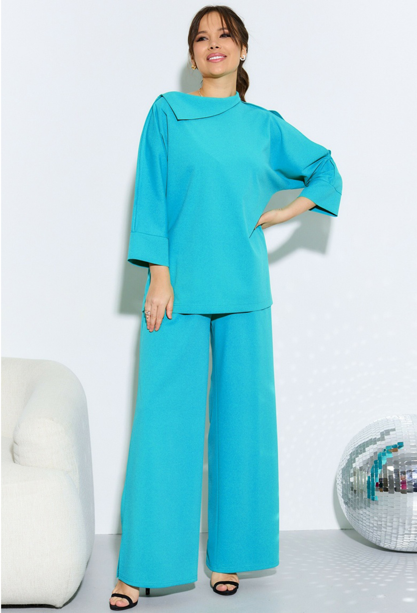 Комплект женский 2-х предметный (блузка, брюки) из трикотажного полотна. Блузка прямого силуэта, рукав- "летучая мышь", по бокам разрезы, спинка длиннее полочки. Горловина ассиметричная с отложным воротником. Верхний шов рукава идет на верх в разутюжку, с одной стороны "слезка". По низу рукава идет манжет. Брюки прямые, по низу разрез, пояс на резинке, по бокам карманы.