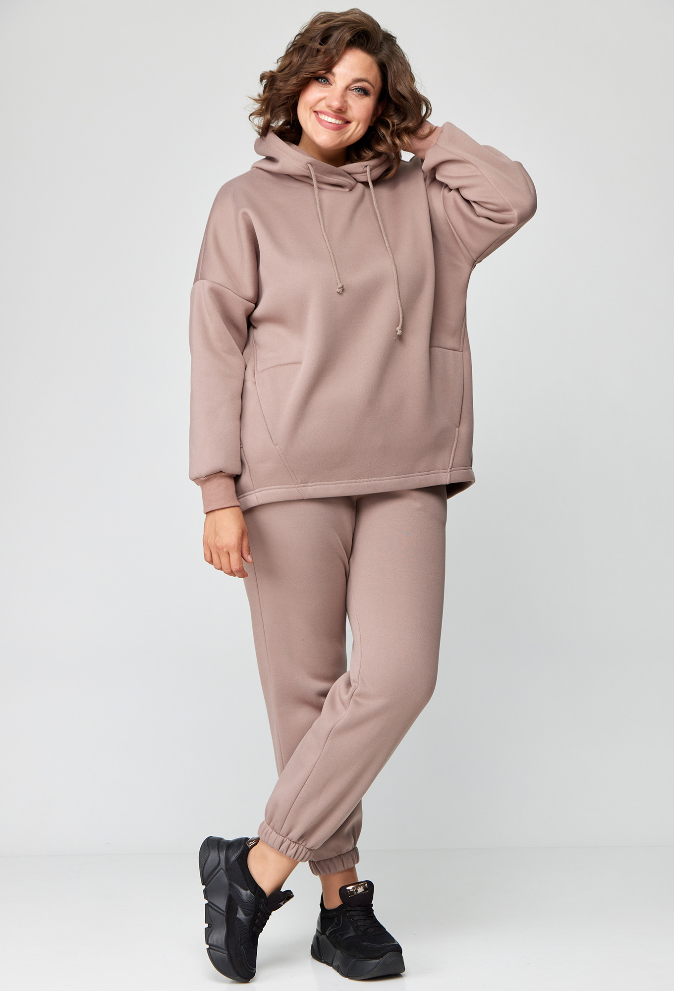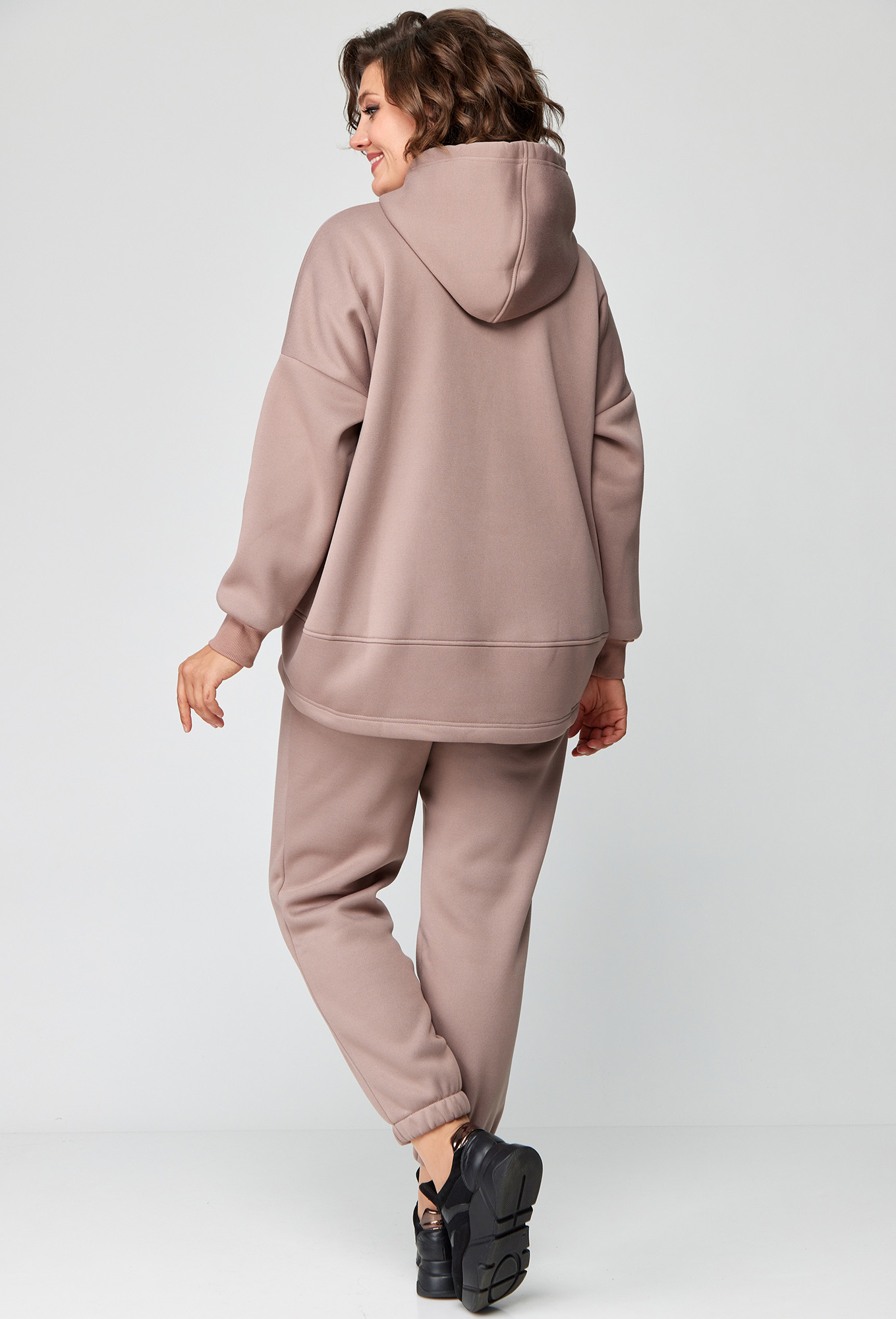 Костюм женский, состоящий из худи и брюк, выполнен из трикотажного полотна с изнаночной стороны на флисе. Худи свободного, объемного силуэта. Полочка худи с подрезами, горловиной круглой формы с капюшоном. Верхняя часть спинки цельная, с переходящими боковыми швами на полочку. Нижняя часть спинки притачная, изогнутой формы, за счет чего образуется объем. Рукав одношовный, длинный, на притачной манжете по низу.