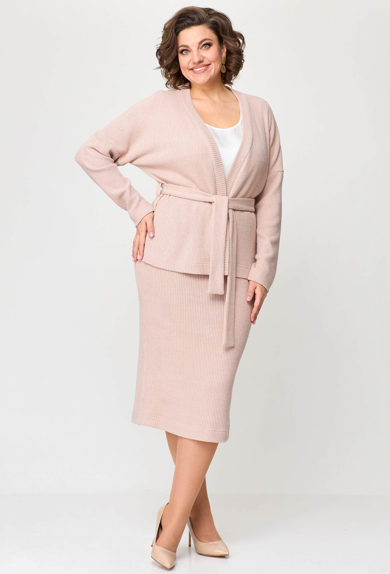 Костюм состоящий из кардигана и юбки выполнен из трикотажного полотна в рубчик. Кардиган прямого силуэта. Полочка кардигана с V - образной горловиной. Спинка цельная. Борта полочки и горловина спинки обработаны притачной планкой. Пройма кардигана углубленной формы. Рукав длинный, одношовный. В области талии по боковым швам настрочены шлевки, через которые продет пояс, завязывающийся спереди.