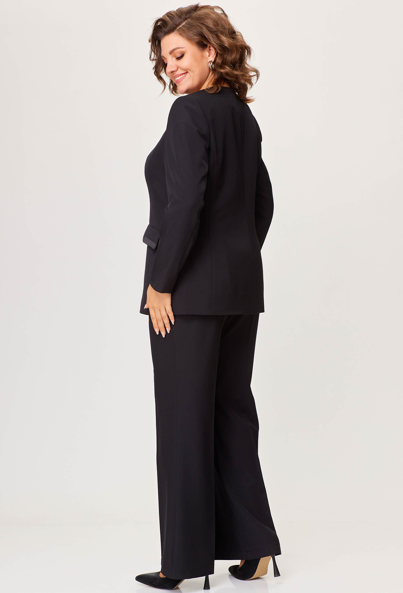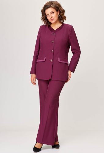 Костюм состоящий из жакета и брюк выполнен из однотонной ткани, в качестве отделки использована ткань с атласным эффектом. Жакет на подкладке.