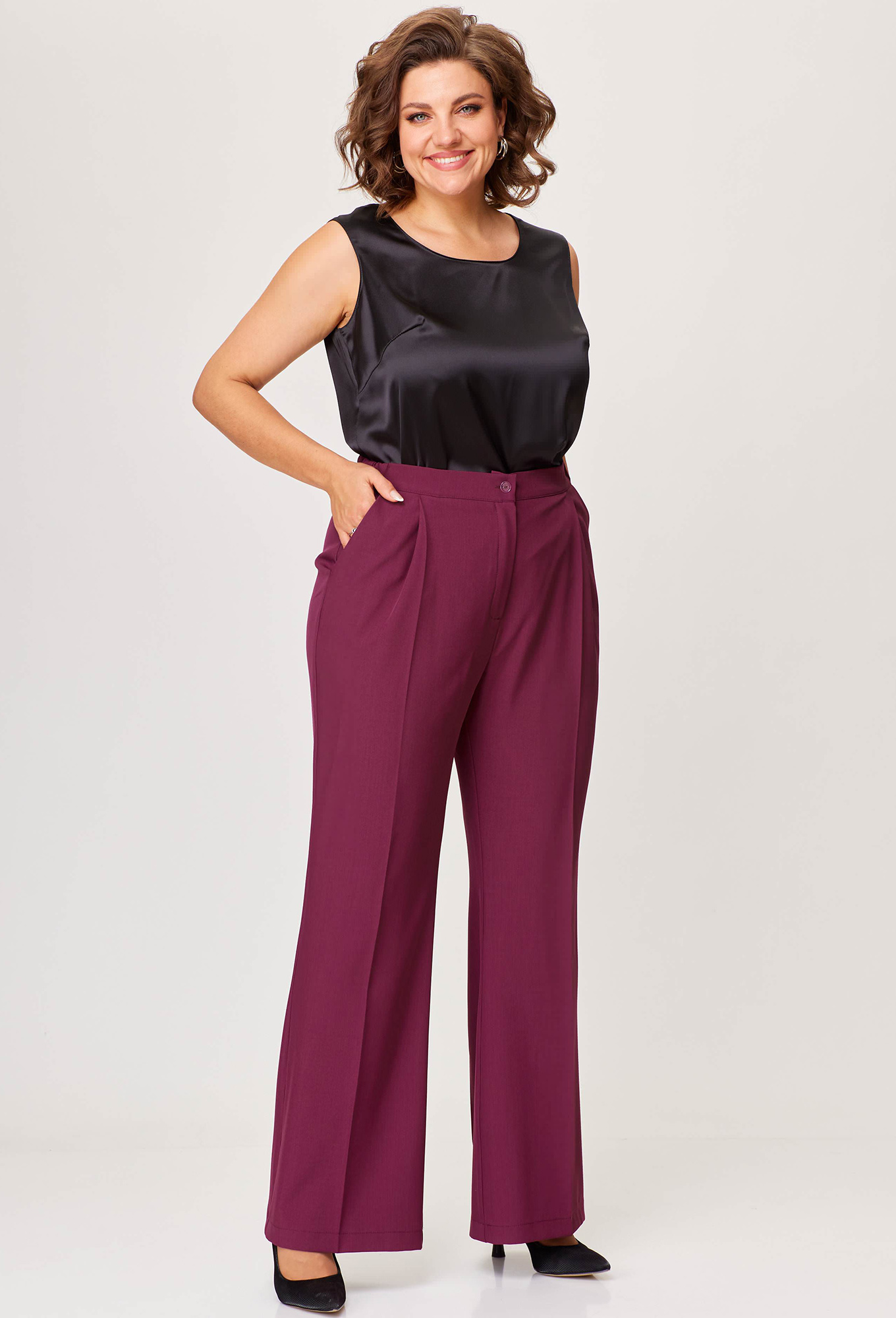 Брюки свободного силуэта, с легким расклешением штанин в нижней части. Передняя часть брюк с наклонными карманами и складками по линии талии. Задняя часть брюк с талиевыми вытачками. В среднем шве передней половинки обработана застежка на молнию. Брюки по талии на притачном поясе с эластичной тесьмой и застежкой на петлю и пуговицу.