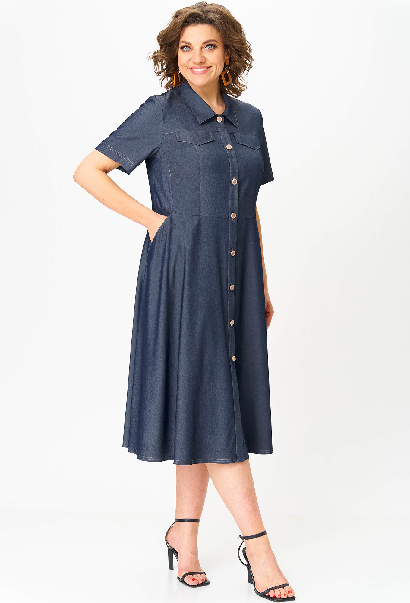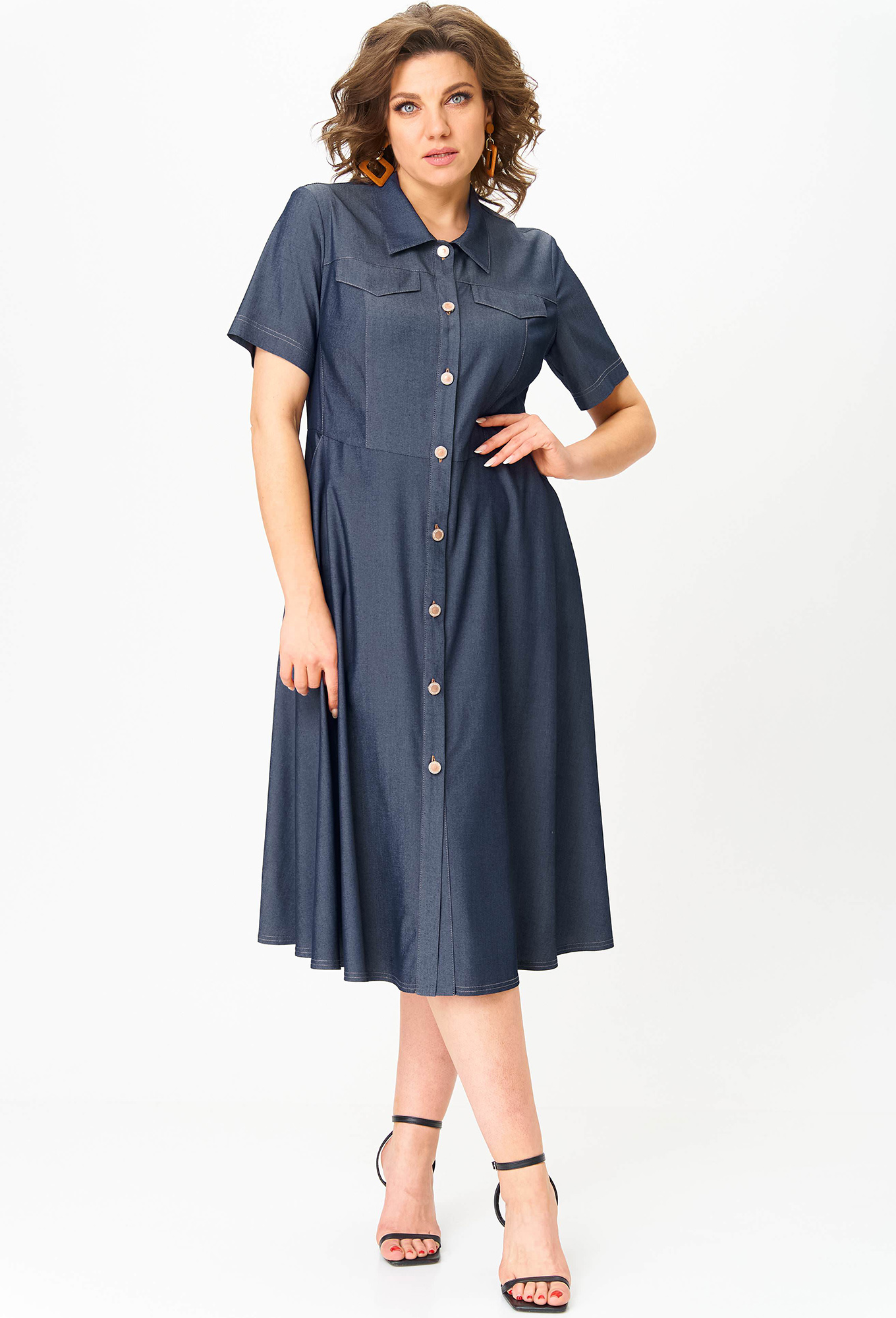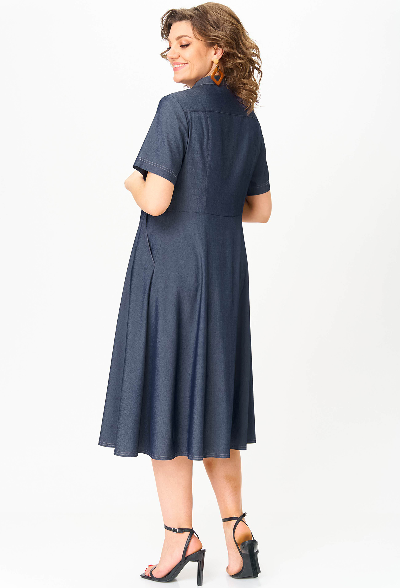 Платье А-образного силуэта, длиной ниже колена. Платье выполнено из однотонной ткани. Платье отрезное по линии талии. Полочка лифа с вертикальными рельефами и отрезной плечевой кокеткой. В шве притачивания кокетки обработаны фигурные клапаны. Спинка с вертикальными рельефами и отрезной плечевой кокеткой. Горловина круглой формы с отложным воротником. Центральная часть полочки с притачными планками и застежкой на петли и пуговицы-болты. Юбка платья формы колокол, по передней половине обработаны наклонные карманы.